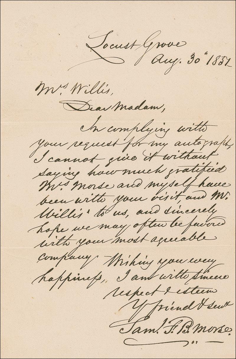 American artist and inventor (1791–1872) whose development of the telegraph revolutionized communication—and indeed, society as a whole—and represented a crucial step toward such later innovations as the telephone. ALS signed “Saml. F. B. Morse,” one page, 4.75 x 7.5, August 30, 1851. Letter to Charles E. Willis. In full: “In complying with your request for my autograph, I cannot give it without saying how much gratified Mrs. Morse and myself have been with your visit, and Ms. Willis’ to us, and sincerely hope we may often be favored with your most agreeable company.” In fine condition, with a uniform shade of mild toning, and a few light wrinkles. Accompanied by the original transmittal envelope, addressed in another hand, and marked “Valuable.”