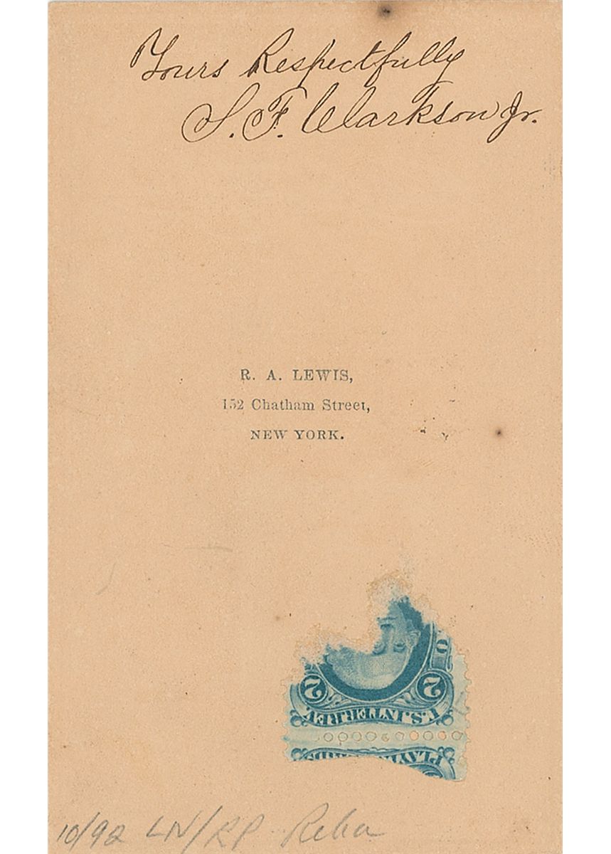Union naval officer. Original 2.25 x 4 carte-de-visite photo by R. A. Lewis of New York, signed on the reverse in black ink, “Yours respectfully, S. F. Clarkson, Jr.” In fine condition, with a pencil notation and revenue stamp remnant to reverse.