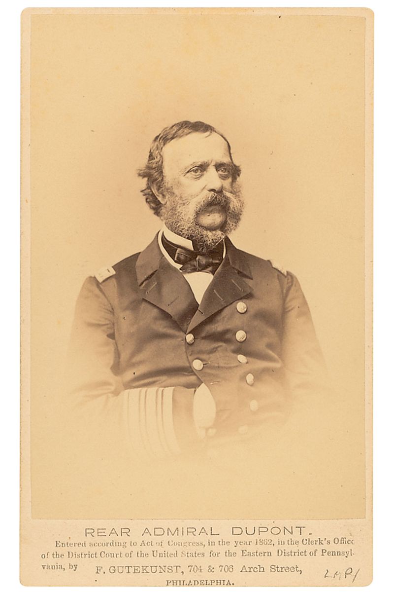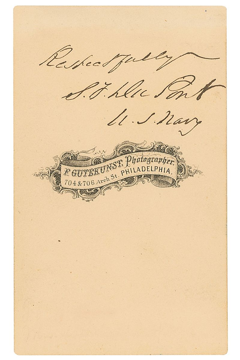 Union naval officer (1803–1865) who made significant contributions to the modernization of the US Navy, despite being blamed for the Union’s failure at Charleston. Scarce and desirable original 2.5 x 4 carte-de-visite bust portrait of Du Pont in uniform by F. Gutekunst of Philadelphia, signed on the reverse in black ink, “Respectfully, S. F. Du Pont, U. S. Navy.” In fine condition.