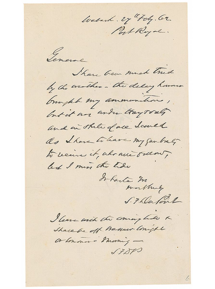 Union naval officer (1803–1865) who made significant contributions to the modernization of the US Navy, despite being blamed for the Union’s failure at Charleston. War-dated ALS signed “S. F. DuPont,” one page, 4.5 x 7.5, February 27, 1862. Letter to an unidentified general. In full: “I have been much tried by the weather—the delay however brought my ammunition, but it was under Hay & Oats and in spite of all I could do I have to have my gunboats to receive it, who will follow, but I miss the tide.” DuPont’s postscript states he will be leaving with the coming tide. Letter is inlaid to a 5.5 x 9 off-white sheet. In fine condition.