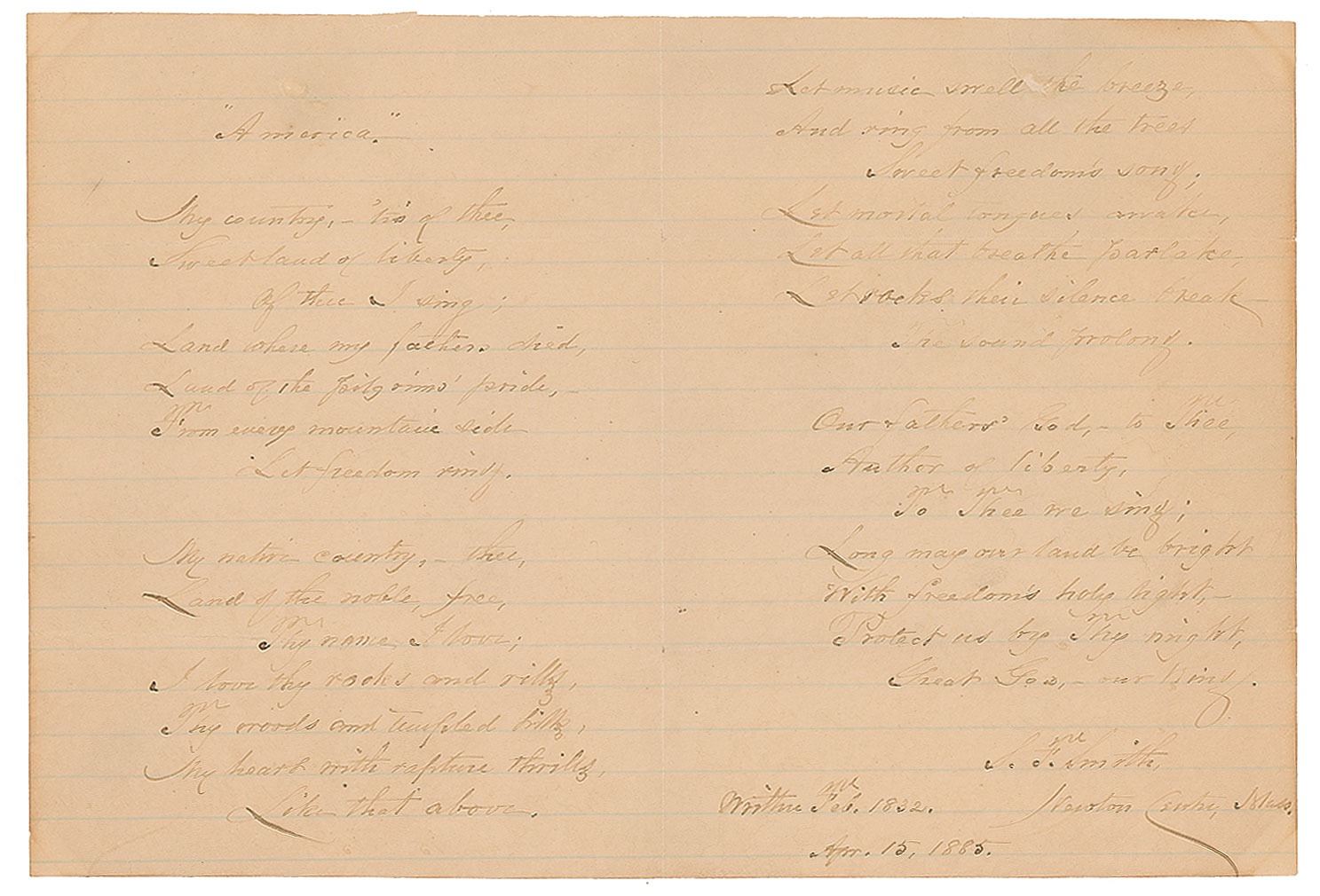 Sought-after autograph manuscript of his poem "America," one page, 9.75 x 6.75, signed at the conclusion, "S. F. Smith, Written Feb. 1832, Newton Centre, Mass, Apr. 15, 1885." Smith pens the four original verses of his iconic poem, beginning: "My country 'tis of thee, / Sweet land of liberty, / of thee I sing. / Land where my fathers died, / Land of the Pilgrims' pride, / From every mountain side, / Let freedom ring." In very good to fine condition, with two areas of thin paper at the top, a tiny tear to the top edge, and all of the writing light but legible.