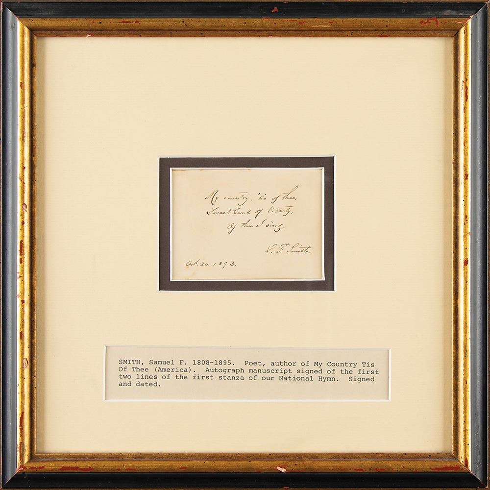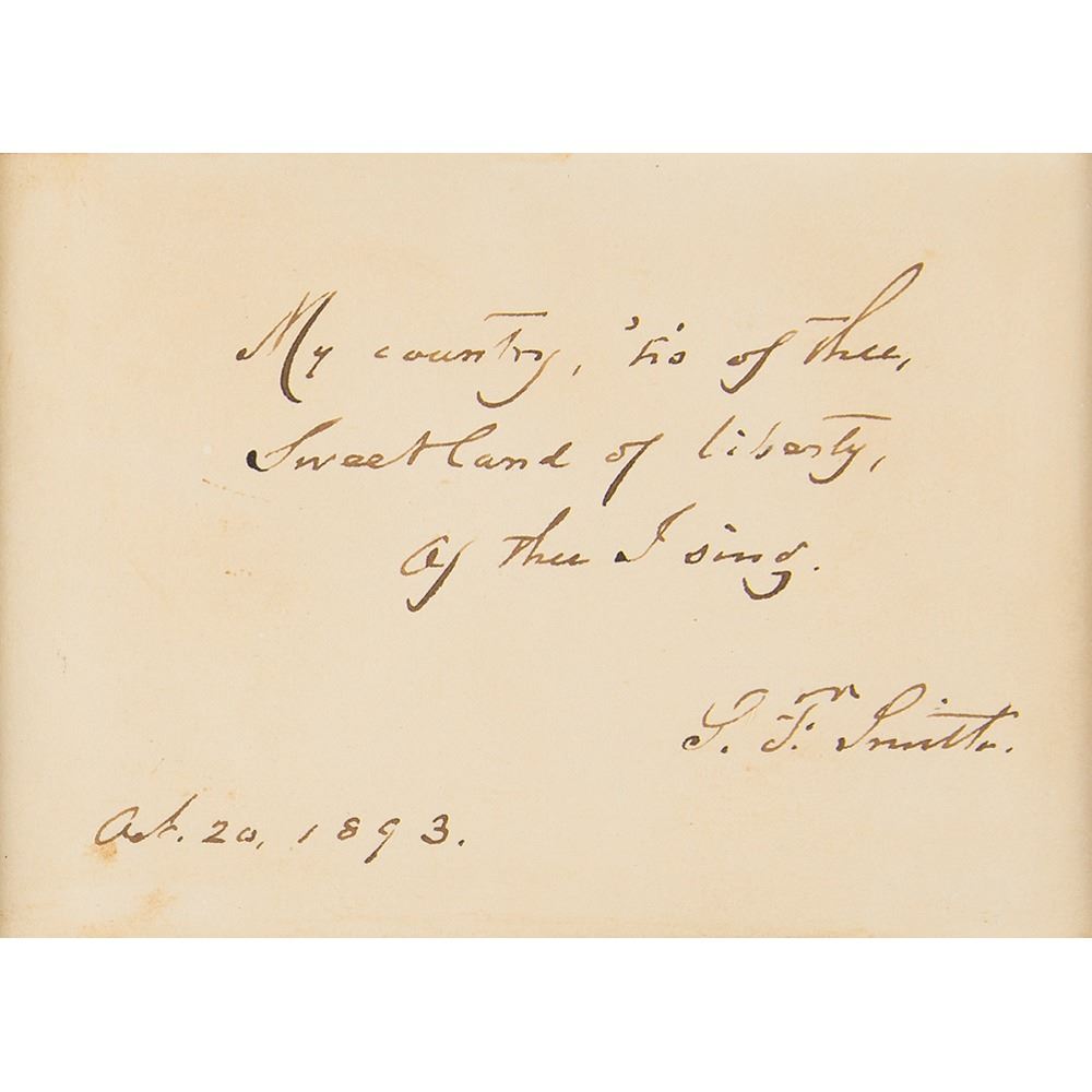 Boston-born Baptist minister and academic (1808–1895) best known as the lyricist of ‘America’ (‘My Country, ’Tis of Thee’), written while he was a student at Andover Theological Seminary. AQS on an off-white 3.5 x 2.5 slip, in full: "My country 'tis of thee, / Sweet land of liberty, / of thee I sing. S. F. Smith, Oct. 20, 1893." Attractively matted and framed with a typed caption to an overall size of 11.25 x 11.25. In fine condition.