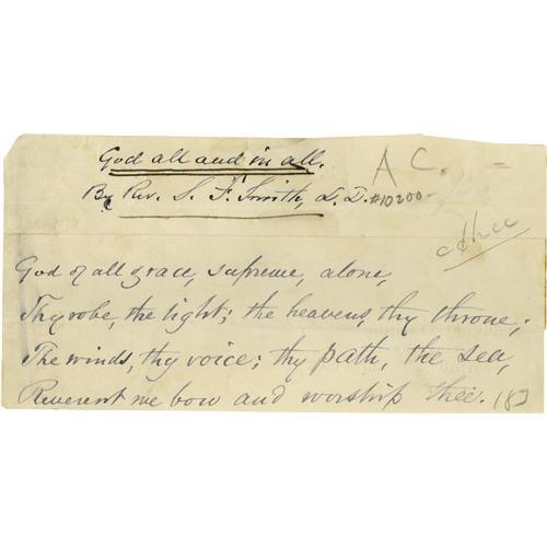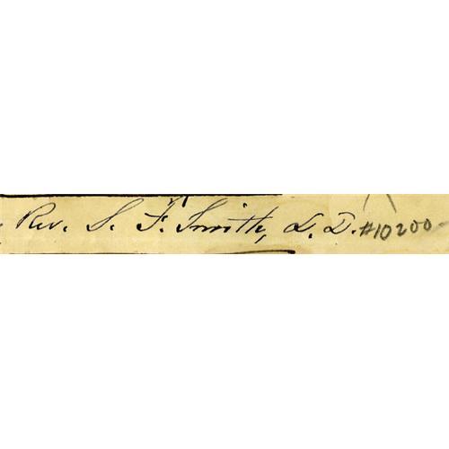 <B>Samuel Francis Smith Autograph Quote Signed</B></I> "<I>Rev. S. F. Smith, D.D.</B></I>". One page, 5.25" x 2.75", np, nd. Smith is best known for the popular patriotic song "America" (aka My Country 'Tis of Thee) though he wrote dozens of other hymns and songs. Offered here are the title, signature, and first four lines of "God All and in All" (circa 1890) in Smith's hand consisting of two paper slips laid down to another sheet. Very good condition with minor ink smearing and very light staining. From the Henry E. Luhrs Collection. Accompanied by LOA from PSA/DNA.