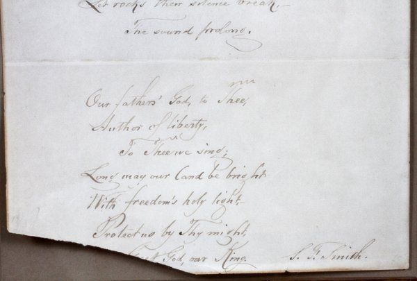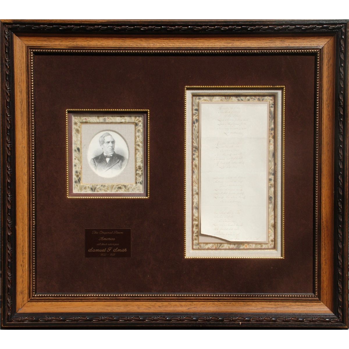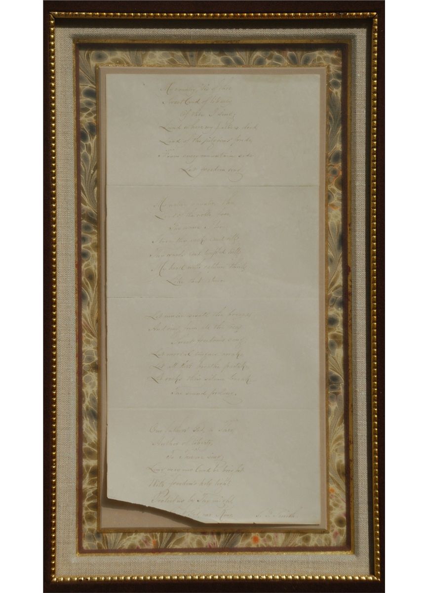 Boston-born Baptist minister and academic (1808–1895) best known as the lyricist of ‘America’ (‘My Country, ’Tis of Thee’), written while he was a student at Andover Theological Seminary. Autograph lyrics, signed “S. F. Smith,” One page folio 6"x 12",mounted in larger shadow box frame. Frame Size - 27'' x 30.5'', no date. Smith pens all four stanzas of his famous hymn, “America.” In part: “My country, ’tis of thee, / Sweet land of liberty, / Of thee I sing; / Land where my fathers died, / Land of the pilgrims’ pride, / From every mountainside, / Let freedom ring.” is missing small bottom portion in the last stanza and sentence the word "Great", otherwise fine condition. A particularly nice example of the patriotic song in its entirety