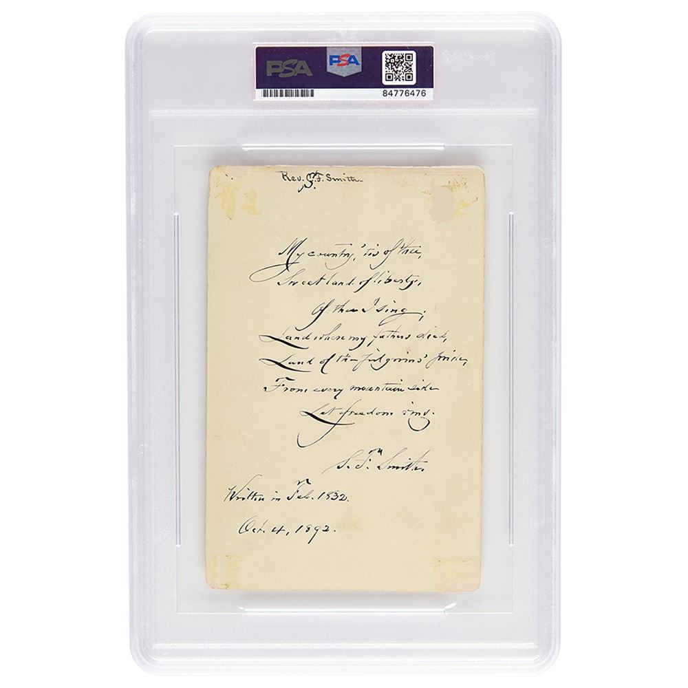Remarkable 4.25 x 6.5 cabinet photo of Samuel Francis Smith in a head-and-shoulders pose, signed in the lower border in black ink, "S. F. Smith, born in Boston, Oct. 21, 1808." On the reverse Smith has penned the first stanza of his beloved poem & #39;America,& #39; in full: "My country, & #39;tis of thee, / Sweet land of liberty, / Of thee I sing; / Land where my fathers died, / Land of the pilgrims& #39; pride, / From every mountain side, / Let freedom ring." Smith signs at the conclusion, "S. F. Smith, Written in Feb. 1832," and adds the date, "Oct. 4, 1892." In fine condition, with mounting traces to corners of reverse. Encapsulated in a PSA/DNA authentication holder. An immensely appealing twice-signed example of the beloved lyricist, enhanced furthermore by the crisply penned first stanza of his patriotic ode to America.