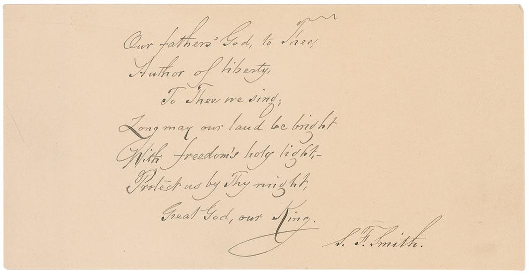Boston-born Baptist minister and academic (1808–1895) best known as the lyricist of ‘America’ (’My Country ’Tis of Thee’), written while he was a student at Andover Theological Seminary. AQS, signed “S. F. Smith,” on an off-white 6 x 3 slip. Smith pens the final stanza from ‘America.’ In full: “Our fathers' God to Thee, Author of liberty, To Thee we sing. Long may our land be bright, With freedom's holy light, Protect us by Thy might,Great God our King.” In fine condition, with a uniform shade of toning. Examples of Smith’s immortal lyrics are highly coveted and are becoming more elusive.