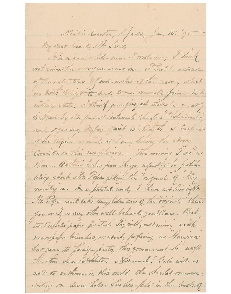 Scarce ALS signed “S. F. Smith,” one page, lightly-lined both sides, 5 x 8, January 15, 1895. Letter to Mr. Secor. In part; “I think your project will be greatly helped by the present excitement about a ‘testimonial’; and, so you say, keeping quiet is strength. I keep out of the affair as much as I can leaving the strong committee to their own planning. This morning I see a Roman Catholic paper from Chicago, repeating the foolish story about Mr. Pope getting the ‘original’ of ‘My Country’ & c. On a postal card, I have set him right. Mr. Pope can’t take any better care of the ‘original’ than you or I, or any other well-behaved gentleman. But the Catholic paper printed ‘Thy will, not mine,’ with newspaper blunders, as usual, proposing, as ‘America’ has gone to foreign parts, this government sh’d adopt the other as a suitable. Not much! God’s will is not to enthrone in this world the Scarlett woman sitting on seven hills. See her fate in the book of Revelation…But the ‘original,’ the scrap of waste paper on which it was written, & the glorious country for which it stands, will remain.” In the middle of the letter Smith pens two stanzas of Isaac Watt’s ‘Babylon.’ In fine condition, with a uniform shade of light toning and a rough left edge. Smith letters are uncommon, particularly with such fabulous content regarding his classic composition.
