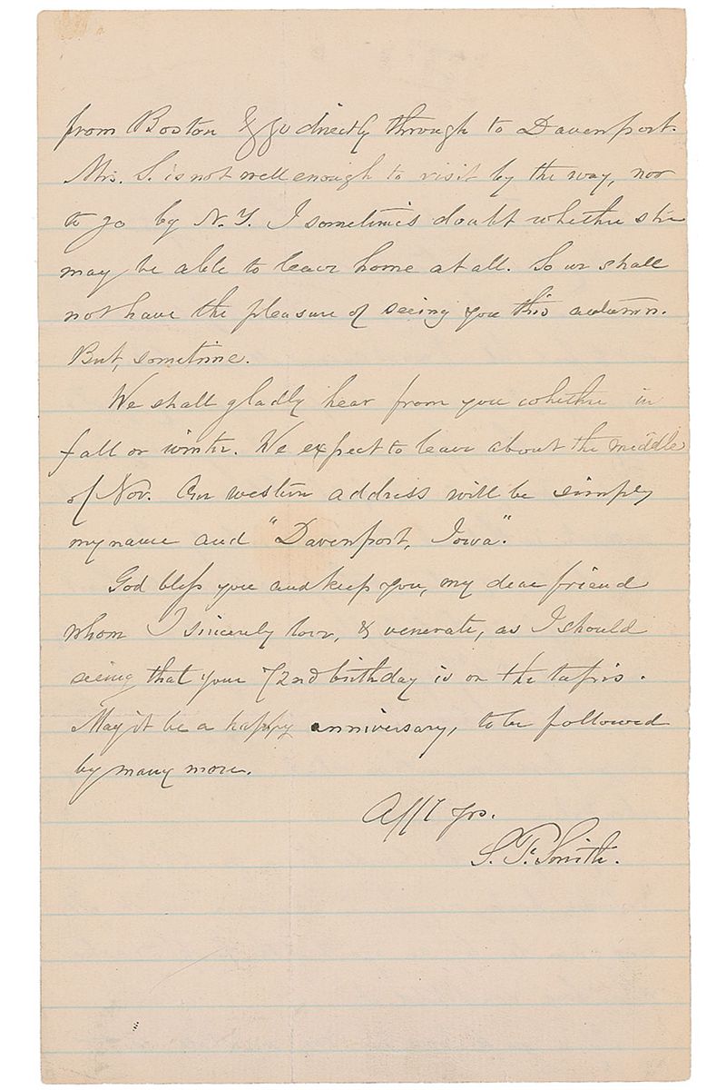 ALS signed “S. F. Smith,” one page, lightly-lined both sides, 5.5 x 9, September 25, 1895. Letter to “my dear old friend.” In part; “Notwithstanding your thoughtful suggestion not to feel that I must answer all your letters directly, I am moved to reply to yours of yesterday & another a few days earlier. I am greatly interested in your pen-&-ink sketch. I know you are such master in that art. Your topic is lovely…My daughter Mrs. Candee has a graphophone cylinder having my voice in ‘America’ on it. It was given her by an agent of the Graph—who came here & exhibited it.” In fine condition, with intersecting folds and some light edge soiling.