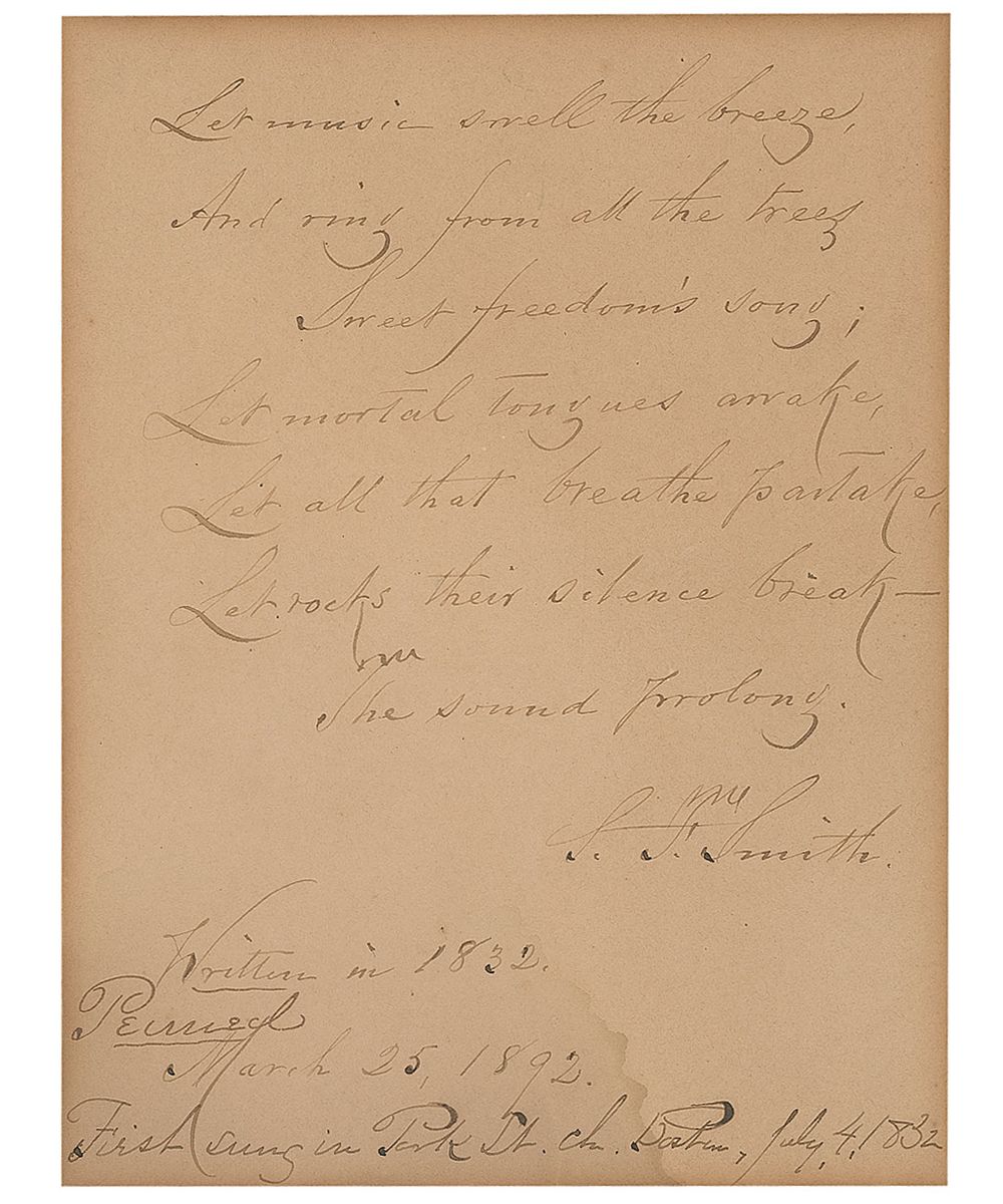 AQS on a 4 x 5.25 off-white sheet. Smith pens the first third of ‘America.’ In full: “Let music swell the breeze / And ring from all the trees / Sweet freedom’s song / Let mortal tongues awake / Let all that breathe partake / Let rocks their silence break / The sound prolong.” Signed at the conclusion, “S. F. Smith, Written in 1832, Penned March 25, 1892, First sung in Park St. Ch., Boston, July 4, 1832.” Sheet is affixed to an identical size piece of cardstock. In very good condition, with uniform toning from previous display and dampstaining to lower left corner.