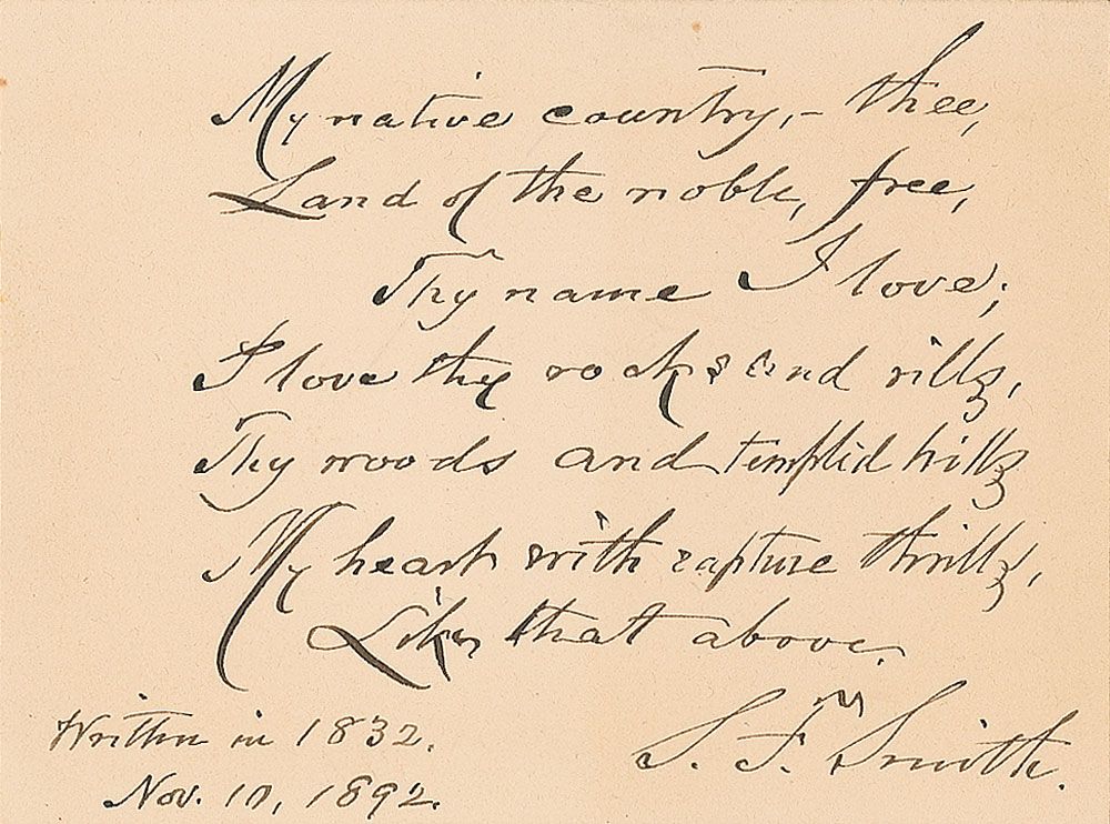 Boston-born Baptist minister and academic (1808–1895) best known as the lyricist of ‘America’ (‘My Country, ’Tis of Thee’), written while he was a student at Andover Theological Seminary. Crisp AQS on an off-white 3.5 x 2.5 card. Smith pens the second stanza from ‘America.’ In full: “My native country, thee, / Land of the noble free, / Thy name I love; / I love thy rocks and rills, / Thy woods and templed hills; / My heart with rapture thrills / Like that above.” Signed at the conclusion, “S. F. Smith, Written in 1832, Nov. 10, 1892.” In fine to very fine condition. Accompanied by an envelope notated by the original collector.