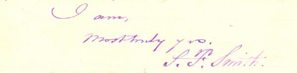 Samuel Francis Smith (October 21, 1808 – November 16, 1895), Baptist minister, journalist and author, is best known for having written the lyrics to "My Country, 'Tis of Thee", which he entitled America. Signature with salutation and accompanied with period print.