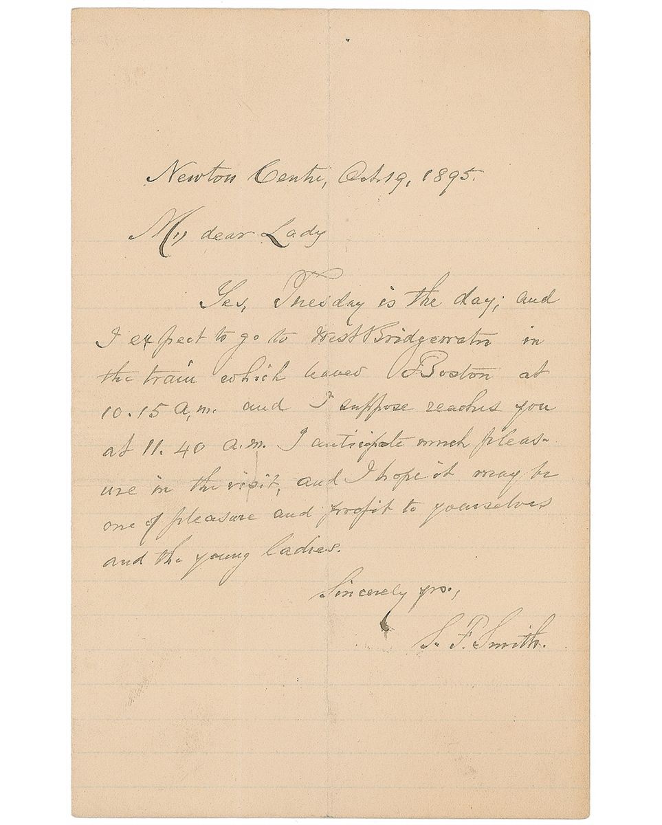 Boston-born Baptist minister and academic (1808–1895) best known as the lyricist of ‘America’ (‘My Country, ’Tis of Thee’), written while he was a student at Andover Theological Seminary. ALS signed “S. F. Smith,” one page, lightly-lined, 4.5 x 7, October 19, 1895. Letter to a lady. In part: “I expect to go to West Bridgewater in the train which leaves Boston at 10.15 a.m. and I suppose reaches you at 11.40 a.m. I anticipate much pleasure in the visit.” Heavy intersecting folds and light toning, otherwise fine condition.