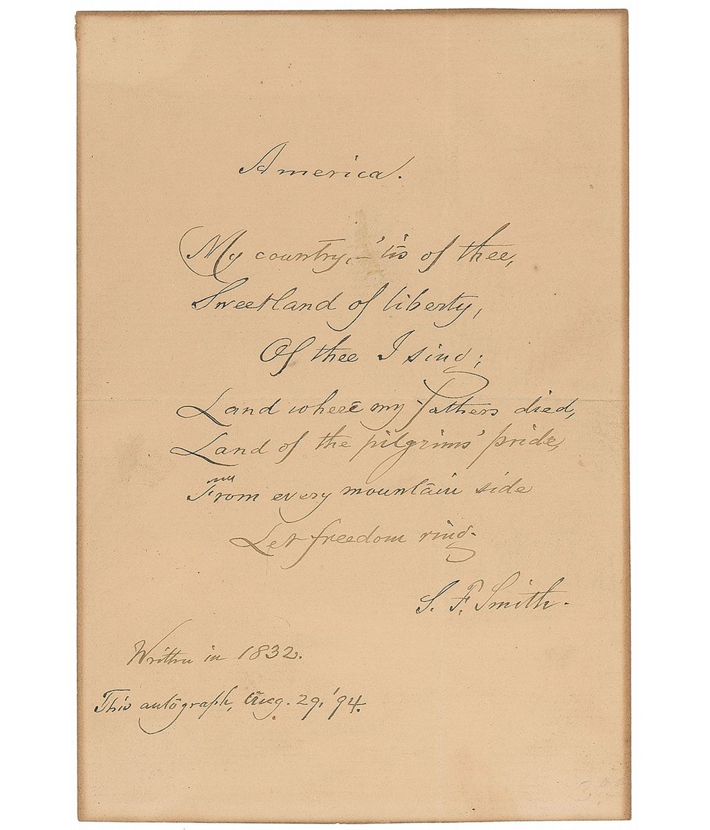 Boston-born Baptist minister and academic (1808–1895) best known as the lyricist of ‘America’ (‘My Country, ’Tis of Thee’), written while he was a student at Andover Theological Seminary. AQS on an off-white 4.5 x 6.5 sheet, signed at the conclusion, “S. F. Smith. Written in 1832. This autograph Aug. 29, ’94.” Smith pens the first stanza of ‘America.’ In full: “My country, ’tis of thee, / Sweet land of liberty, / Of thee I sing; / Land where my fathers died, / Land of the pilgrims’ pride, / From every mountainside, / Let freedom ring.” Intersecting folds (one vertical fold passing through a single letter of the signature and a small separation at the left edge), uniform toning, and a spot of adhesive to the first line, otherwise fine condition.