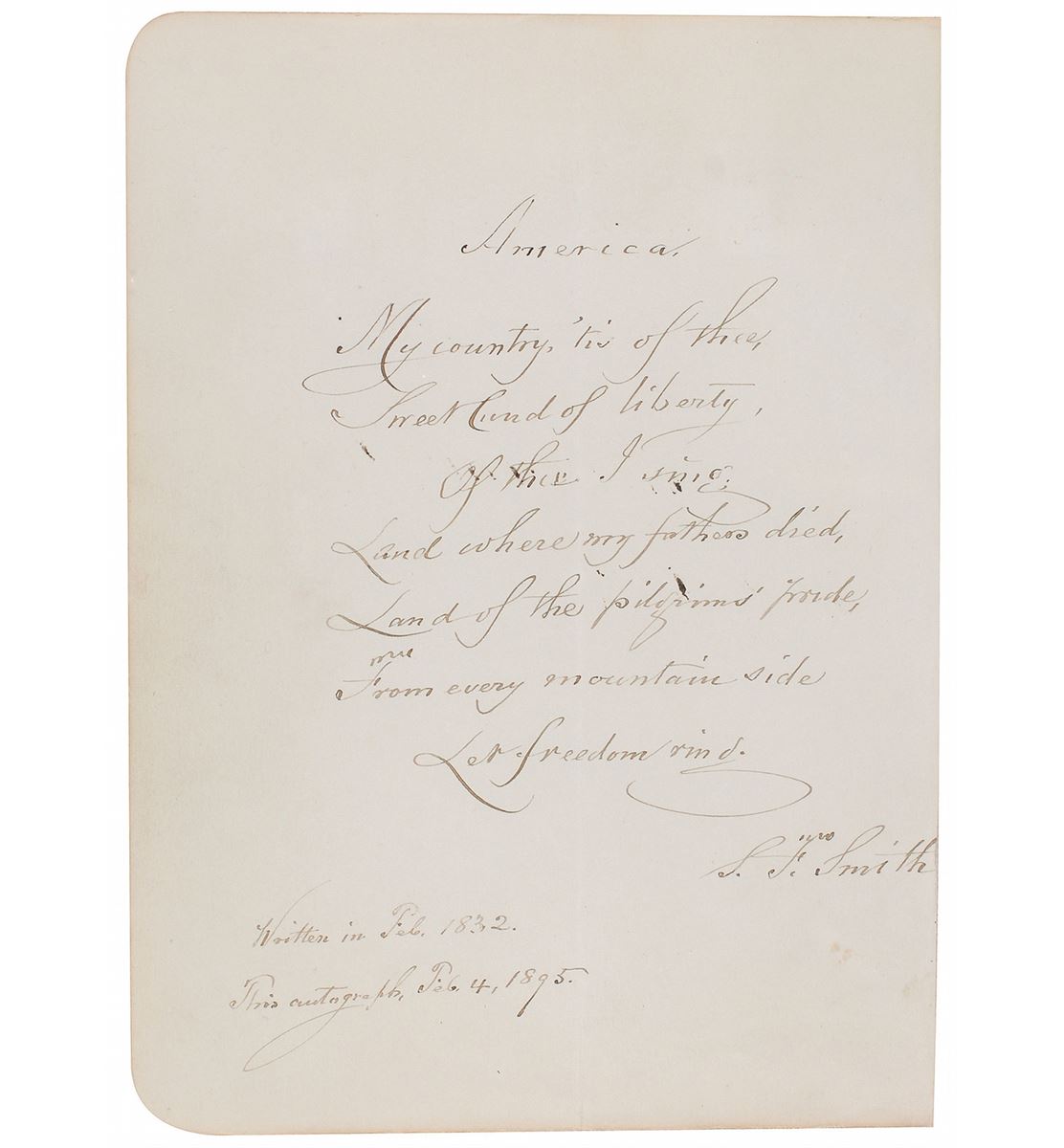 AQS on an off-white 5.75 x 8 sheet, signed at the conclusion in crisp ink, “S. F. Smith.” Smith quotes from his famous ‘America.’ In full: “My country, ’tis of thee, / Sweet land of liberty, / Of thee I sing; / Land where my fathers died, / Land of the pilgrims’ pride, / From every mountain side, / Let freedom ring.” At the conclusion he adds, “Written in Feb. 1832, This autograph Feb. 4, 1895.” Mounted, cloth-matted, and framed to an overall size of 10.25 x 12.75. A central vertical fold, light soiling, and toning to edges, otherwise fine condition.