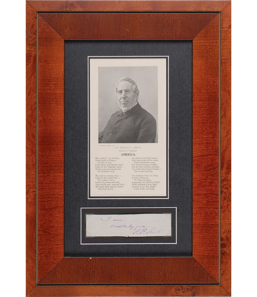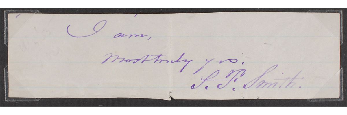 Purple ink signature, “I am, most truly yrs, S. F. Smith,” on an off-white 4.25 x 1 lightly-lined slip clipped from a letter. Matted and framed with a lyric sheet for ‘America’ to an overall size of 10.25 x 14.75. In fine condition, with a small separation to central vertical fold, and erased pencil notations.