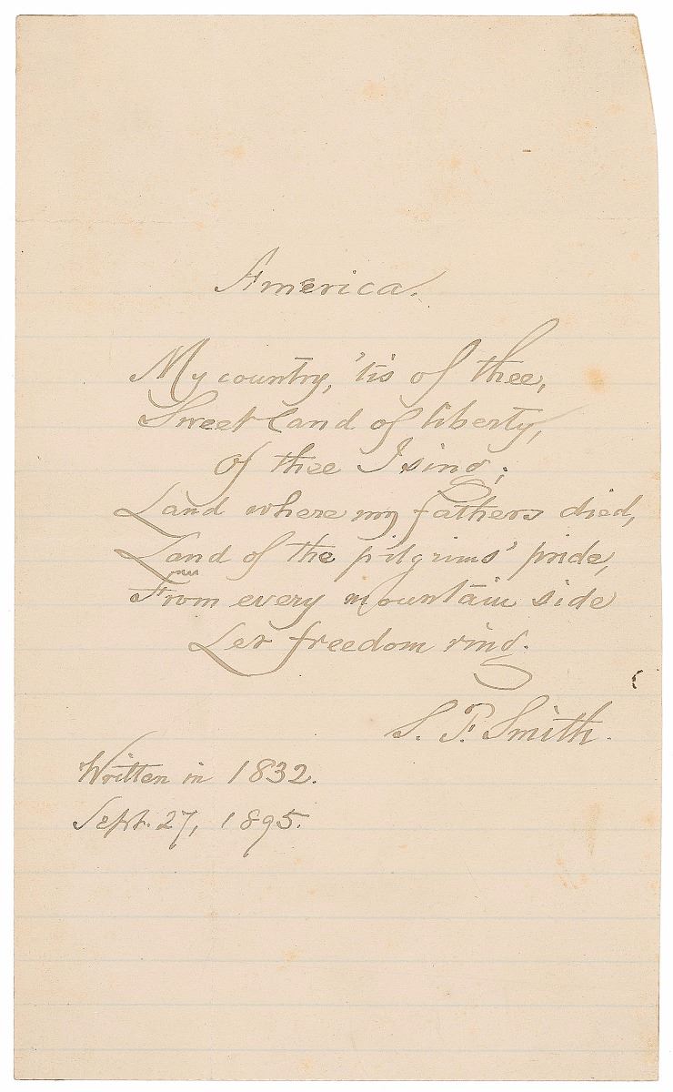 AQS on an off-white 4.25 x 7 lightly lined sheet, signed at the conclusion, “S. F. Smith.” Smith pens a portion of his famed ‘America.’ In part: “My country, ’tis of thee, / Sweet land of liberty, / of thee I sing.” He adds the dates of composition and signs below, “Written in 1832. Sept., 27, 1895.” Intersecting folds, light foxing, and trimmed edges, otherwise fine condition.