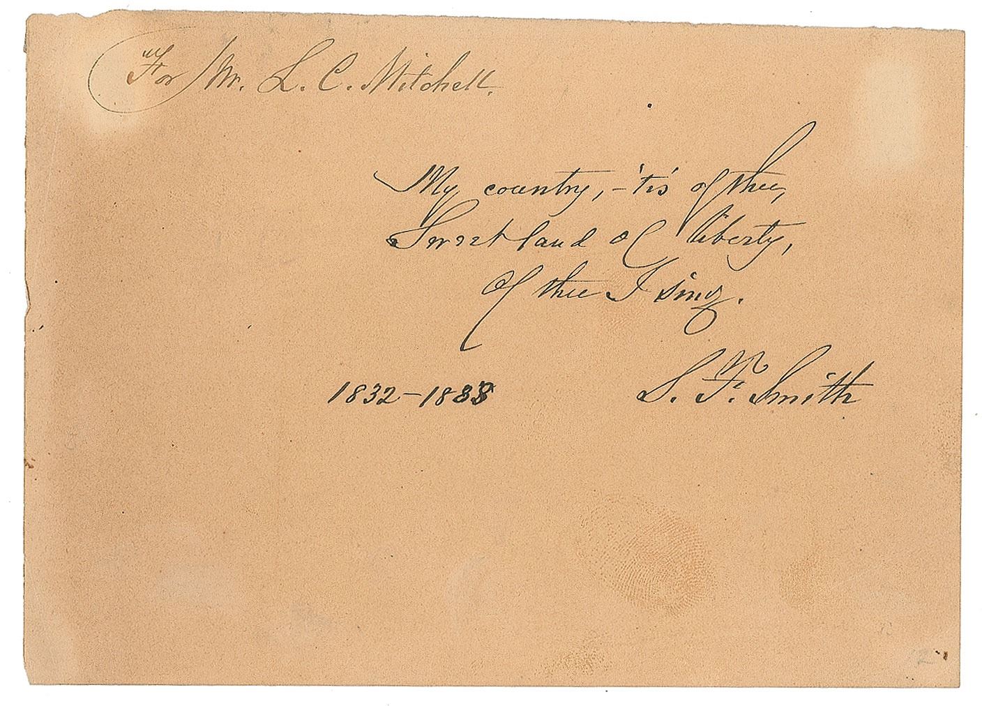 Sought-after AQS on an off-white 6 x 4.25 sheet, signed and inscribed in ink, "For Mr. L. C. Mitchell, S. F. Smith, 1832–1888." Smith pens the famous lines from his poem 'America,' in full: "My country, 'tis of thee, / Sweet land of liberty, / Of thee I sing." In very good to fine condition, with creases to the bottom corners and somewhat irregular light toning.