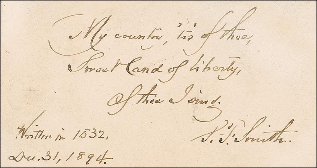 The words that eventually became a tradition, particularly among US school children, were written by Smith while he was studying at Andover Theological Seminary in 1832. More than 60 years later, the autograph requests kept coming! Despite the public’s enduring admiration, not everyone was as enamored. When Oliver Wendell Holmes Sr recommended Smith as a potential candidate for an honorary doctorate from Harvard University in 1893, the university president declined, noting that My Country 'Tis of Thee was better known for its melody, which Smith did not write, than its lyrics. Holmes predicted that the song, and its lyrics would be sung for centuries. To that end, he was absolutely correct, with examples of Smith’s handwritten and signed creation are still very much in demand.