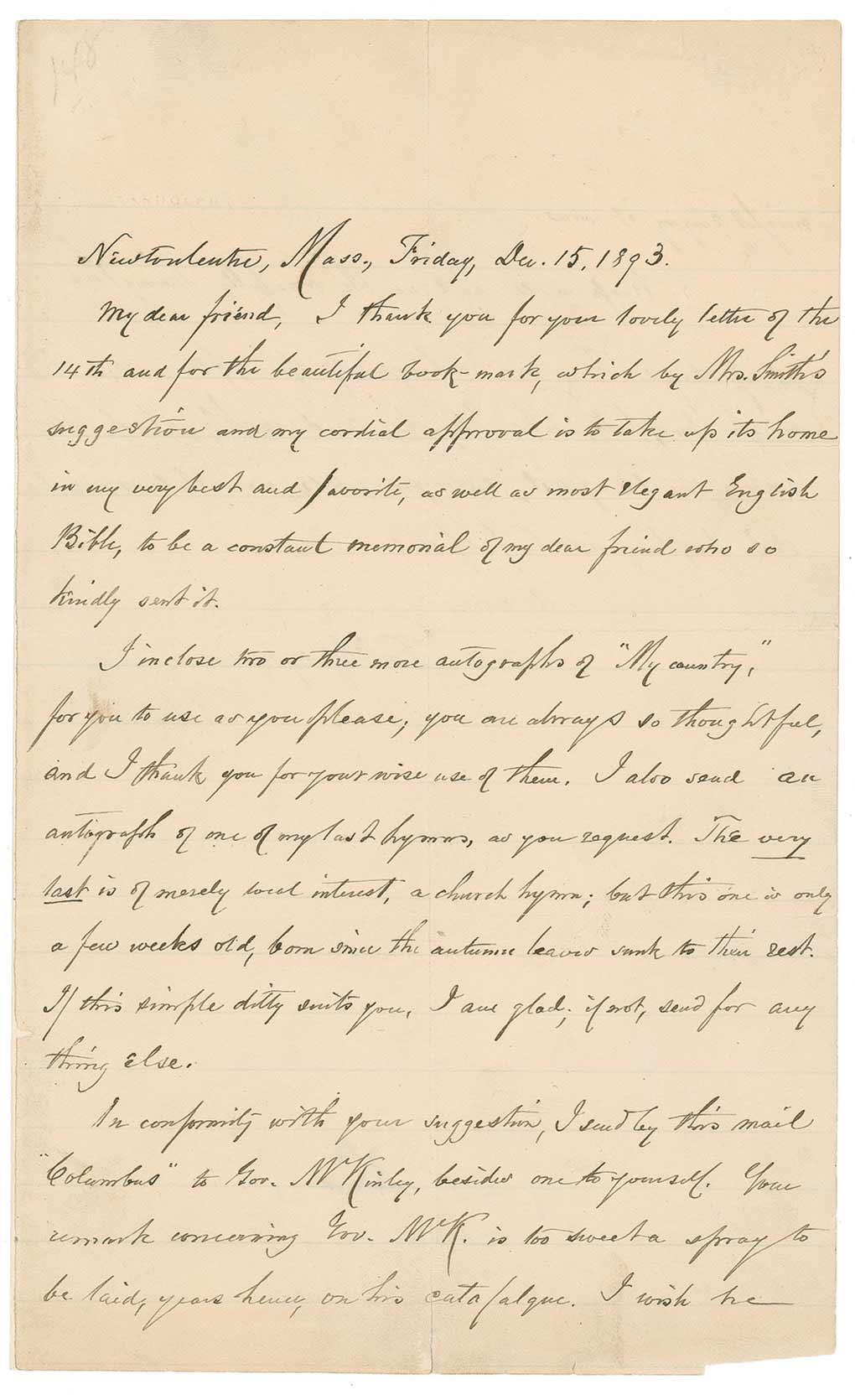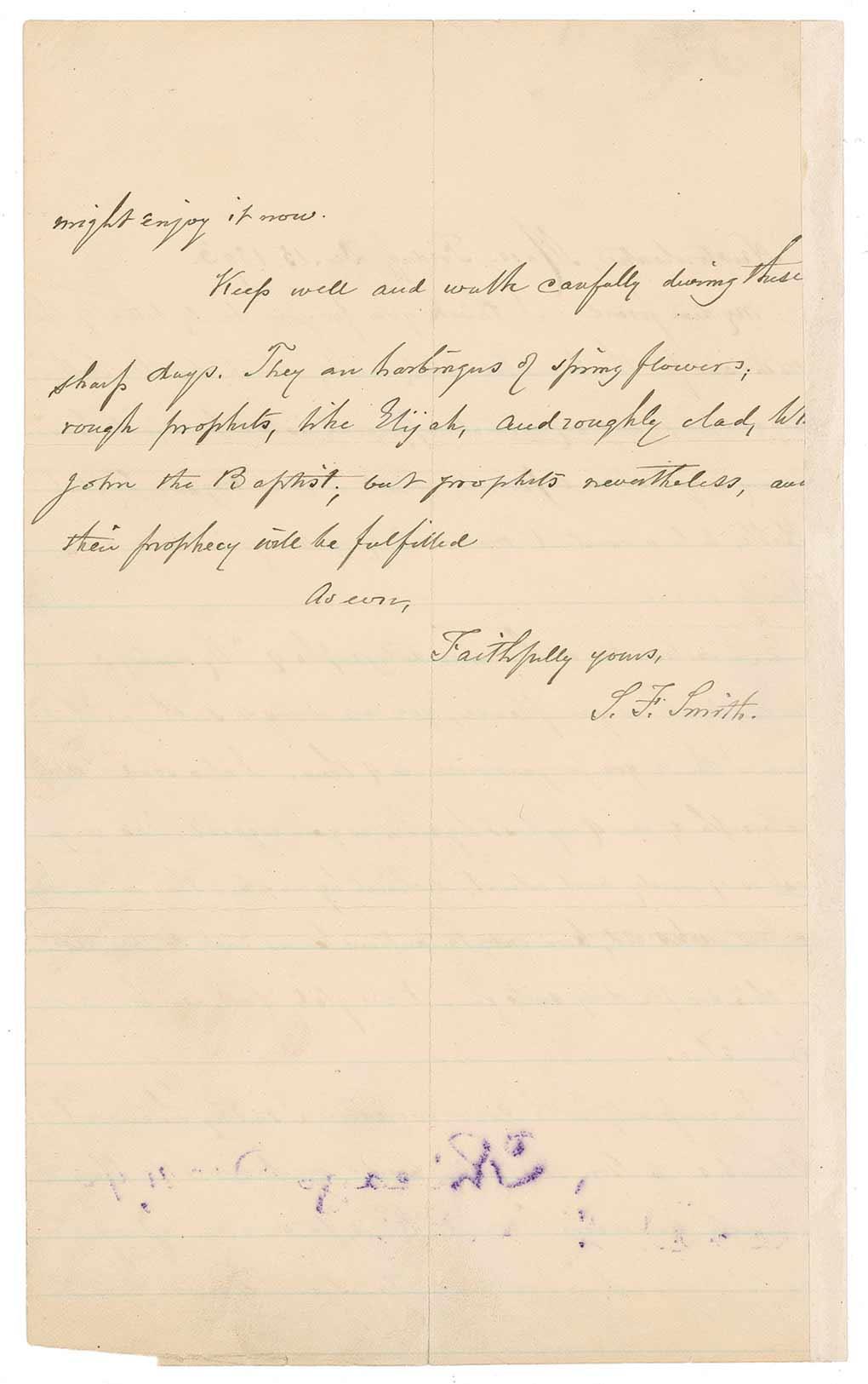 ALS signed “S. F. Smith,” one page, lightly-lined both sides, 5.5 x 9, December 15, 1893. Letter to a friend. In part: “I thank you…for the beautiful book mark, which by Mrs. Smith’s suggestion and my cordial approval is to take up its home in my very best and favorite, as well as most elegant English Bible…I enclose two or three more autographs of ‘My Country’ for you to use as you please, you are always so thoughtful, and I thank you for your wise use of them. I also send an autograph of my last hymns as you requested. The very last is of merely local interest, a church hymn; but this one is only a few weeks old…If this simple ditty suits you, I am glad, if not, send for anything else…Keep well and walk carefully during these sharp days. They are harbingers of spring flowers, rough prophets, like Elijah, and roughly clad, like John the Baptist, but prophets nonetheless, and their prophecy will be fulfilled.” Also included is an AQS, signed “S. F. Smith,” on an off-white 3.25 x 2 card. Smith pens the opening two lines of My Country Tis of Thee: “My country ‘tis of thee, Sweet land of liberty, Of thee I sing. Written in 1832, Dec. 31, 1894.” In very good to fine condition, with light soiling to letter and quote, a couple small separations to intersecting folds to letter, mounting strip along right edge of reverse of letter, and some ink remnants to bottom of letter.