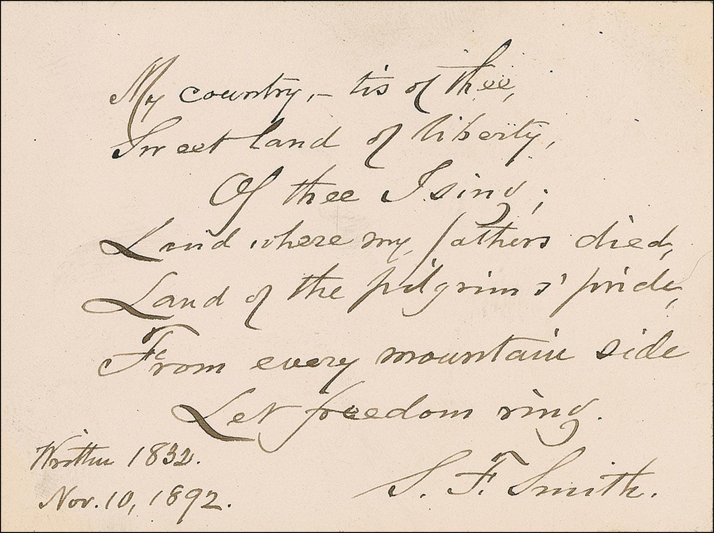 Clergyman, poet, and author of the nation’s hymn, ‘America.’ AQS on an off-white 3.5 x 2.5 card, Smith pens the first stanza of ‘America.’ In full: “My country, ’tis of thee,/Sweet land of liberty,/Of thee I sing;/Land where my fathers died,/Land of the pilgrims’ pride,/From every mountainside,/Let freedom ring.” Signed “S. F. Smith. Written 1832” and adding the presumed date of signing, “Nov. 10, 1892.” In fine condition with very faint edge toning. A patriotic message that earned Smith accolades decades, and now centuries, after the lyrics were composed.