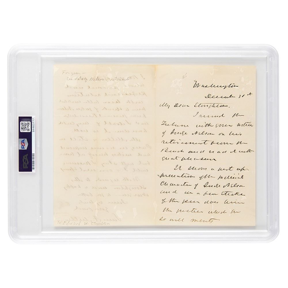ALS, two pages on two adjoining sheets, 5 x 7.75, December 31. Handwritten letter regarding the retirement of fellow Supreme Court justice Samuel Nelson, in part: "I received the Tribute with your notice of Judge Nelson on his retirement from the Bench and read it with great pleasure. It shows…appreciation of the judicial character of Judge Nelson…I know of no man whose personal and professional relations with him better enabled him to speak of Judge Nelson from personal knowledge and I doubt if any could have." In fine condition. Encapsulated in a PSA/DNA authentication holder.