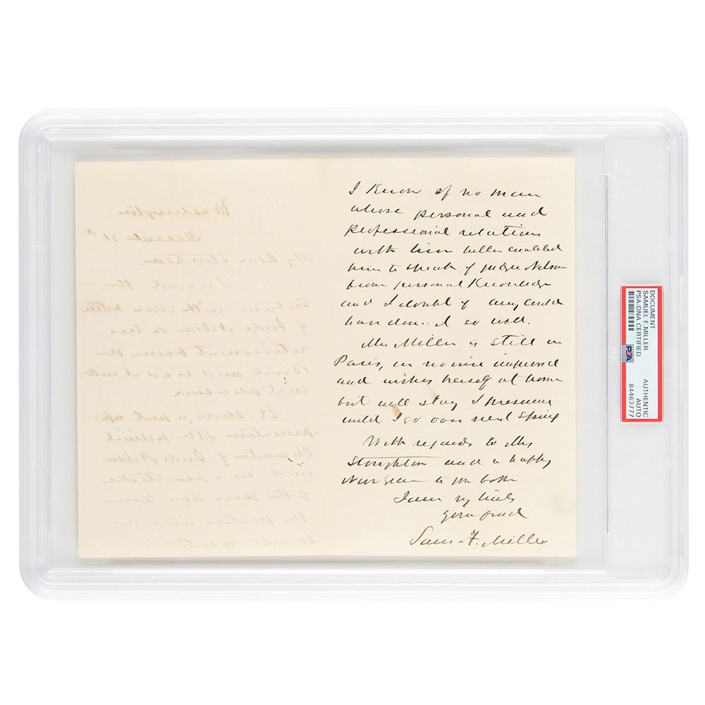 Associate justice of the United States Supreme Court (1816-1890) who served from 1862 until his death. ALS, two pages on two adjoining sheets, 5 x 7.75, December 31. Handwritten letter regarding the retirement of fellow Supreme Court justice Samuel Nelson, in part: "I received the Tribute with your notice of Judge Nelson on his retirement from the Bench and read it with great pleasure. It shows…appreciation of the judicial character of Judge Nelson…I know of no man whose personal and professional relations with him better enabled him to speak of Judge Nelson from personal knowledge and I doubt if any could have." In fine condition. Encapsulated in a PSA/DNA authentication holder.