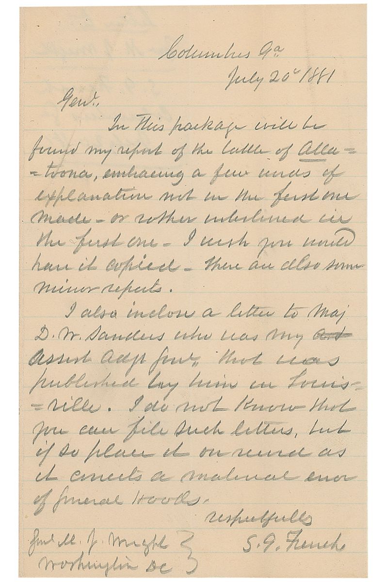 Solider and wealthy plantation owner (1818-1910) who served as a major general in the Confederate army, commanding a division in the Army of Tennessee in the Western Theater. ALS signed “S. G. French,” one page, lightly-lined, 5 x 8, July 20, 1881. Letter to General Marcus Wright. In part: “In this package will be found my report of the battle of Allatoona, embracing a few words of explanation not in the first one made—or rather underlined in the first one—I wish you would have it copied. There are also some minor reports. I also inclose [sic] a letter to Maj. D. W. Sanders who was my assist. adj. genl. that was published by him in Louisville. I do not know that you can file such letters, but if so place it on record as it corrects a material error of General Hood’s.” Professionally inlaid into a slightly larger off-white sheet. In fine condition. The Battle of Allatoona was fought on October 5, 1864, when a division led by French attacked a Union garrison held by Brigadier General John M. Corse in an attempt to take the fortified position that protected the railroad through Allatoona Pass. Corse's forces sustained a bloody two-hour long attack with heavy casualties, and French seemed poised for victory—however, he received a false report from his cavalry that a strong Union force was approaching and withdrew. An apocryphal tale stemming from this battle is that Sherman sent a signal to ‘hold the fort,’ a quote now attributed to him.