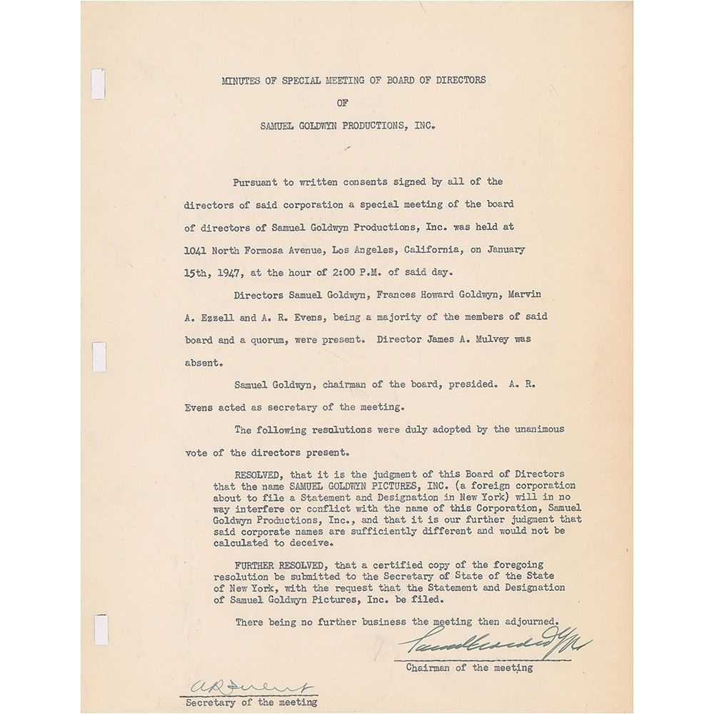 DS, one page, 8.5 x 11, January 15, 1947. A document regarding "Minutes of Special Meeting of Board of Directors of Samuel Goldwyn Productions, Inc.," which resolves "that the name Samuel Goldwyn Pictures, Inc. (a foreign corporation about to file a Statement and Designation in New York) will in no way interfere or conflict with the name of this Corporation." Signed at the conclusion by Goldwyn as chairman of the meeting. In fine condition.