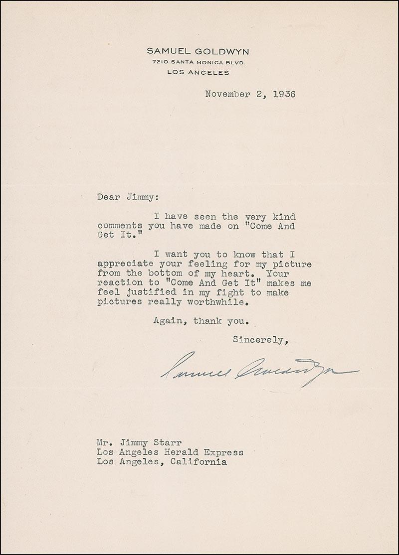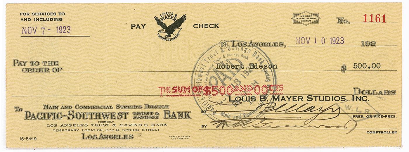 Two items: TLS, signed “Samuel Goldwyn,” one page, 7.25 x 10.5, personal letterhead, dated November 2, 1936. Goldwyn sends thanks for compliments on a film. In part: “I have seen the very kind comments you have made on ‘Come and Get It’…Your reaction…makes me feel justified in my fight to make the pictures really worthwhile.”; and a Louis B. Mayer Productions business check, 8.5 x 3, filled out in type and signed by Mayer, payable to Robert Edeson for $500.00, stamp dated November 10, 1923. In fine condition, with three vertical folds to check, one through a single letter of signature, and cancellation mark lightly affecting signature.