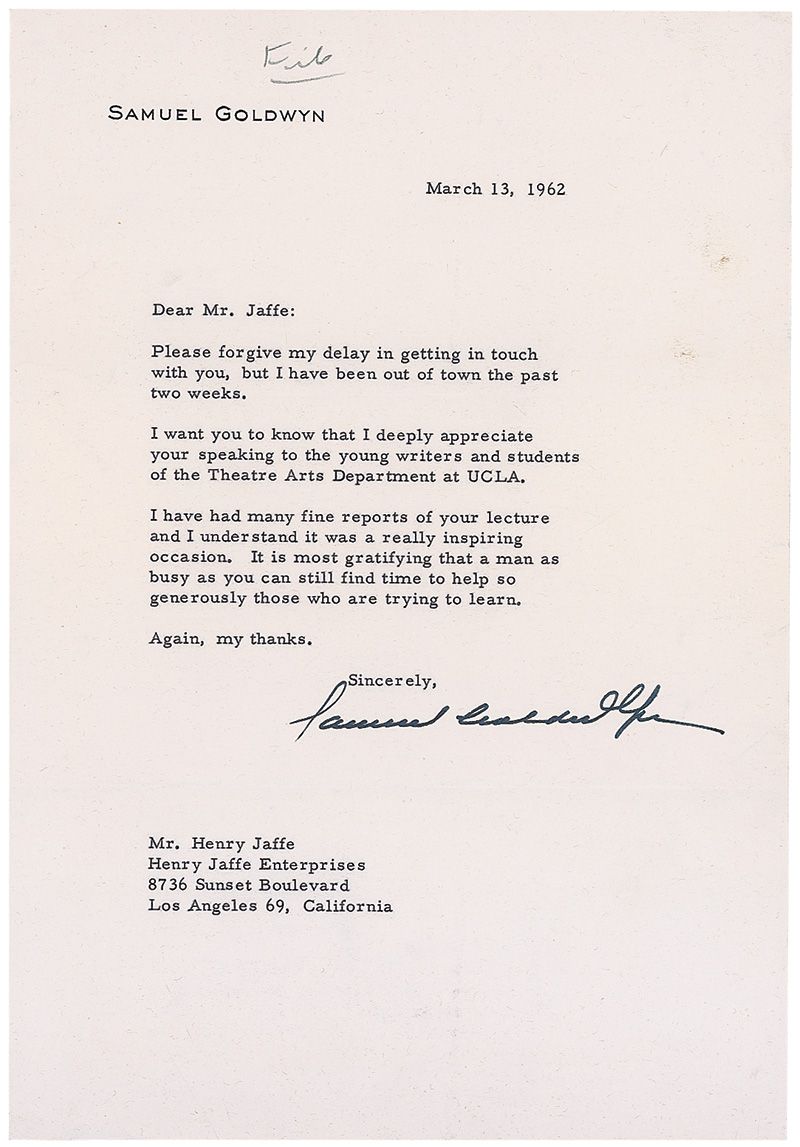TLS, one page, 7.25 x 10.5, personal letterhead, March 13, 1962. A letter of thanks to Henry Jaffe. In part: “I want you to know that I deeply appreciate your speaking to the young writers and students of the Theatre Arts Department at UCLA. I have had many fine reports of your lecture and I understand it was a really inspiring occasion. It is most gratifying that a man as busy as you can still find the time to help so generously those who are trying to learn.” A light vertical crease, scattered soiling to the upper right, and a pencil notation at the top, otherwise fine condition.