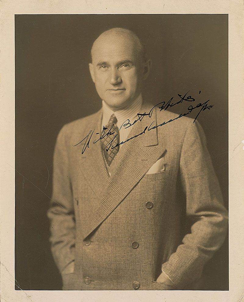 Vintage pearl-finish 8 x 10 portrait by Blackstone Studios of New York, boldly signed in fountain pen, “With best wishes, Samuel Goldwyn” In very good condition, with scattered noticeable creases, a few cracks to the emulsion, and a couple slight brushes to the signature.