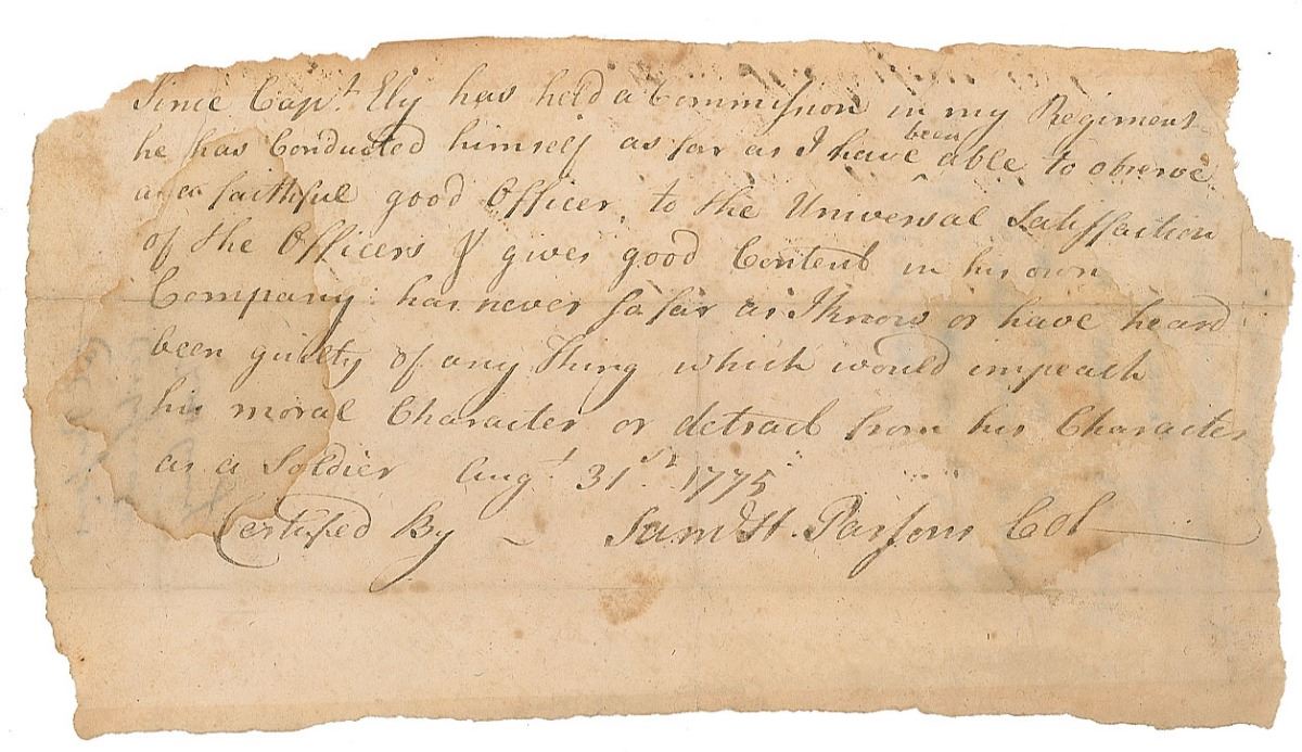 Important Continental Army general (1737–1789) who served continuously from the Lexington Alarm through the British surrender at Yorktown. Revolutionary War–dated DS, signed “Sam’l H. Parsons Col.,” one page, 7.75 x 4.25, August 31, 1775. A statement recommending an officer, in part: “Since Capt. Ely has held a Commission in my Reigment he has Conducted himself as far as I have been able to observe as a faithful good Officer, to the Universal Satisfaction of the Officers & gives good Content in his own Company, has never so far as I know or have heard been guilty of any Thing which would impeach his moral Character or detract from his Character as a Soldier.” In very good condition, with light staining and soiling, and one small area of thin paper.