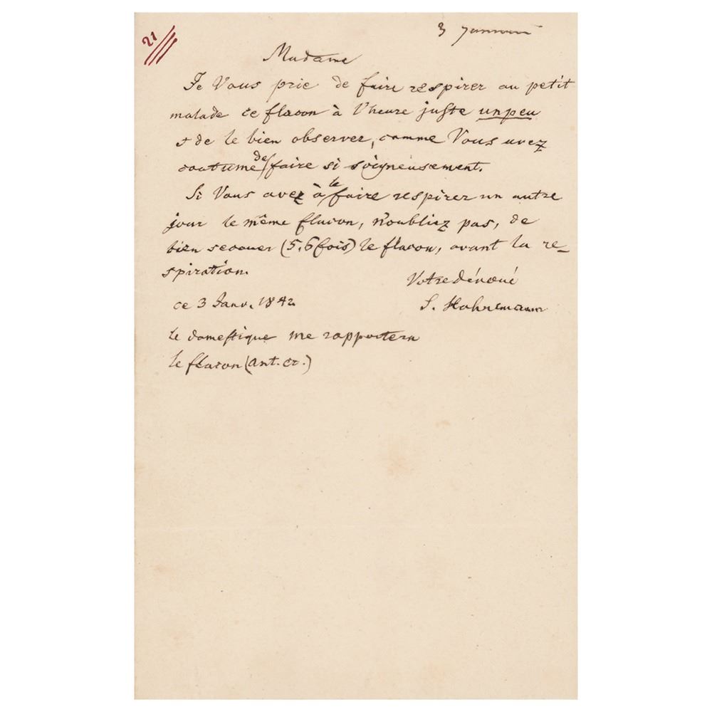 ALS in French, signed ‰ÛÏS. Hahnemann,‰Û one page, 3.75 x 6, January 3, 1842. Untranslated handwritten letter to a lady. In fine condition.