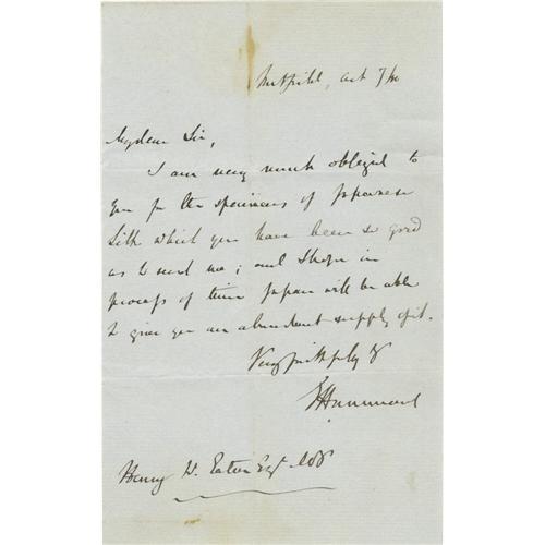 <B>Samuel Hammond Autograph Letter Signed,</B></I> "<I>S. Hammond</B></I>", 4.5" x 7.25", regarding the silk trade with Japan. Hammond served under Nathaniel Green in the American Revolutionary War as a commander of cavalry. He commanded Georgia Volunteers in the Creek War. President Thomas Jefferson appointed Hammond military and civil governor of Upper Louisiana Territory. He later served as a member of the Eighth Congress. The letter is undated. There is some minor staining, otherwise the letter is in fine condition.<BR><BR><b>Shipping:</b> Flat Material, Small (<a target="_blank" href="http://www.heritageauctions.com/common/shipping.php">view shipping information</a>) <BR><BR><B>Important notice: