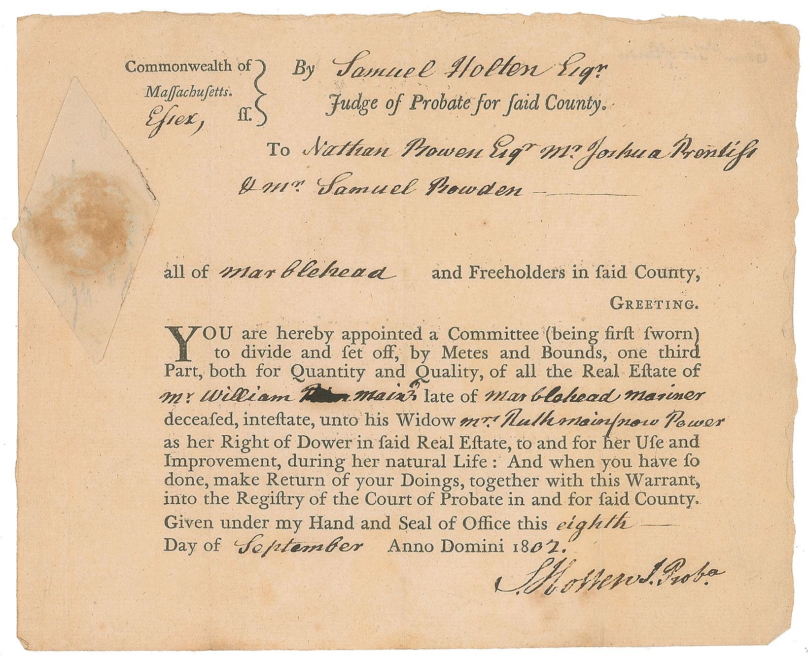 Uncommon partly-printed DS, signed “S. Holten, J. Prob'a,” one page, 7.75 x 6.25, September 8, 1802. Written order made by Samuel Holten, judge of probate Essex County, issued to Nathan Bowen, Joshua Prentiss, and Samuel Bowden of Marblehead, which states: "You are hereby appointed a Committee…to divide and set off, by Metes and Bounds, one third Part, both for Quantity and Quality, of all the Real Estate of Mr. William Main, late of Marblehead mariner deceased, intestate, unto his Widow Mrs. Ruth Main / now Power as her Right of Dower in said Real Estate...for her Use and Improvement, during her natural Life." Signed at the conclusion by Holten. Upper left bears the original white paper seal. In fine condition.