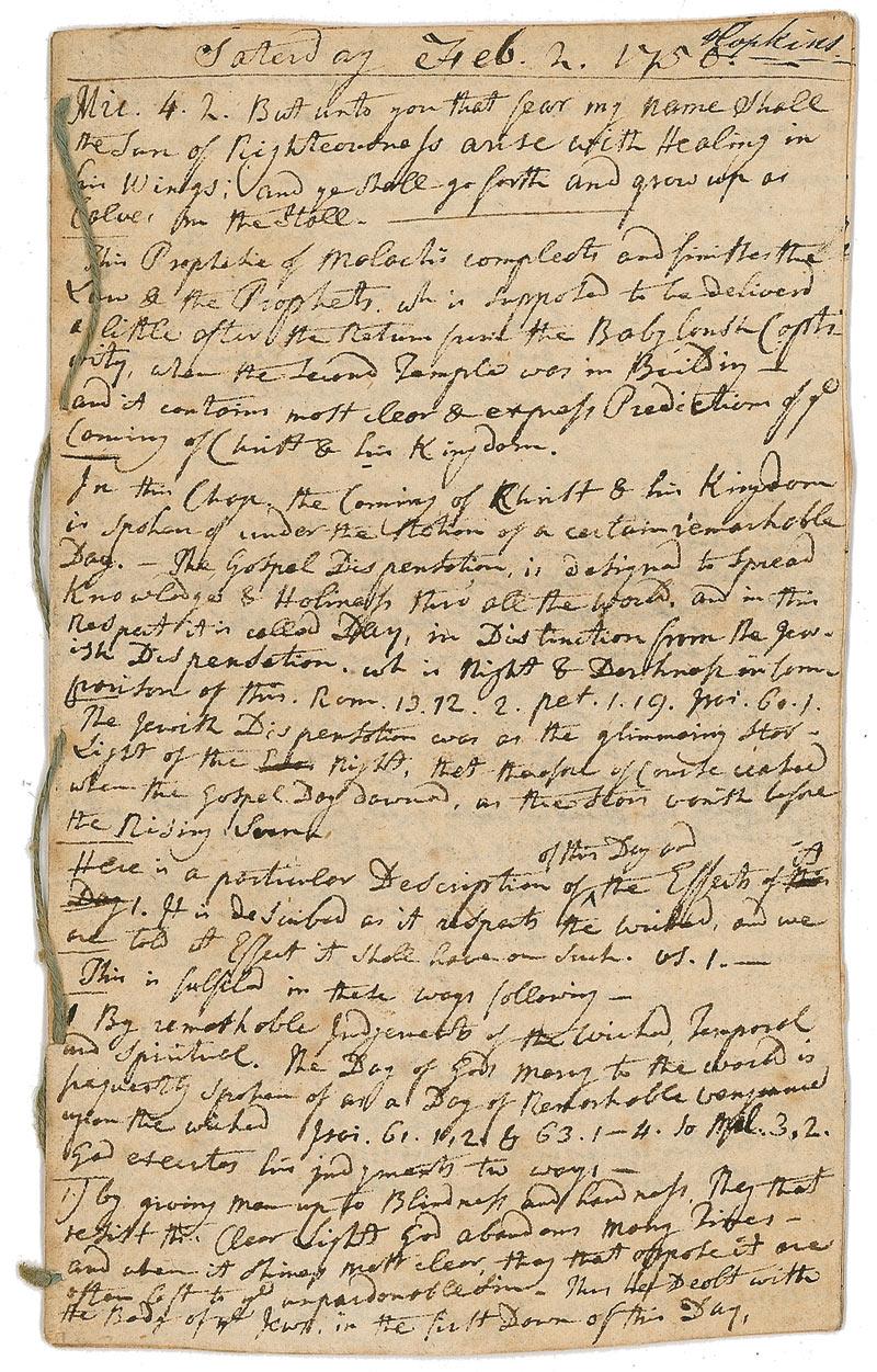 American clergyman (1721–1803) who founded the doctrine of Hopkinsianism or New Divinity, a form of Calvinism that espoused free will and the denial of original sin. Hopkins was also an early and prominent abolitionist who published his views in the pamphlet “A Dialogue Concerning the Slavery of Africans.” Scarce handwritten manuscript, evidently an extract from a journal or diary, signed at the top of the first page “Hopkins” and at the conclusion, “Samuel Hopkins, D.D.,” eight pages on four sheets stitched into booklet form, 3 x 4.75, the first page dated February 2, 1750. A lengthy collection of scriptural passages with commentary by Hopkins. A few excerpts: “M[alach]i 4:2. ‘But unto you that fear my name shall the Sun of Righteousness arise with Healing in his Wings; and ye shall go forth and grow up as calves in the stall.’ This Prophecie of Malachi complects[?]…the Law & the Prophets…. The Bigger part of the Nations of the world have not yet received any Healing from the Sun…. How is Christ to be prized? He is the source of all spiritual light & life….” In fine overall condition, with pencil notations to back of last page, and a bit of mild toning.