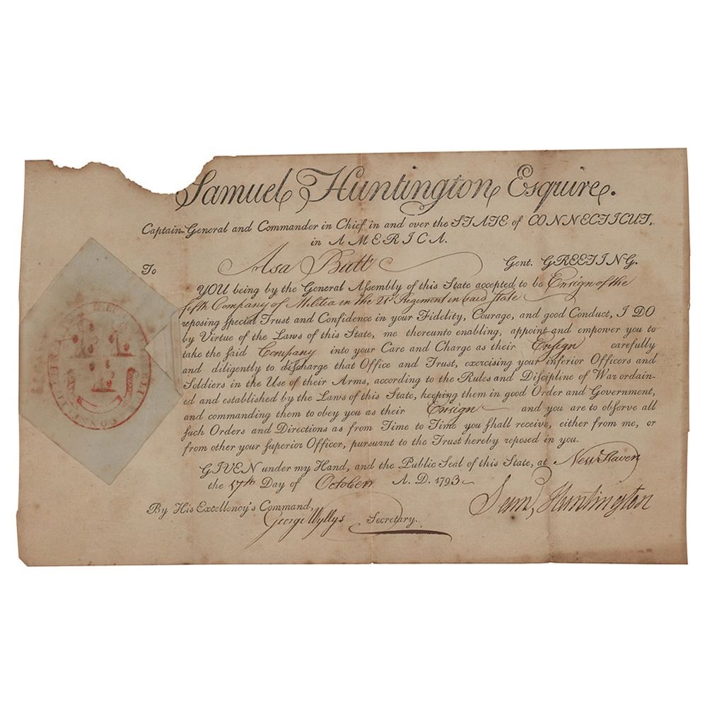 Partly-printed DS, signed “Sam'l Huntington,†one page, 12 x 7.5, October 17, 1793. As governor of Connecticut, Huntington appoints Asa Butt "to be Ensign of the fifth Company of Militia in the 21st Regiment of said State." Prominently signed at the conclusion by Governor Huntington and countersigned by George Wyllys. The embossed white paper seal affixed to the left side remains intact. In very good to fine condition, with light staining and toning, and paper loss to the top edge.