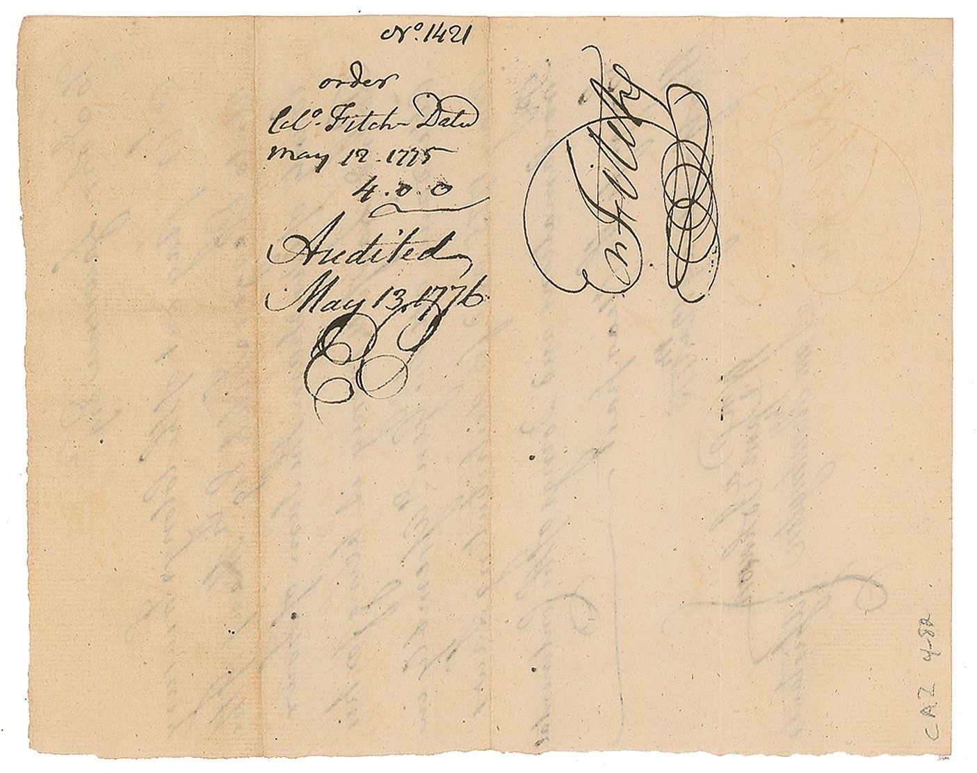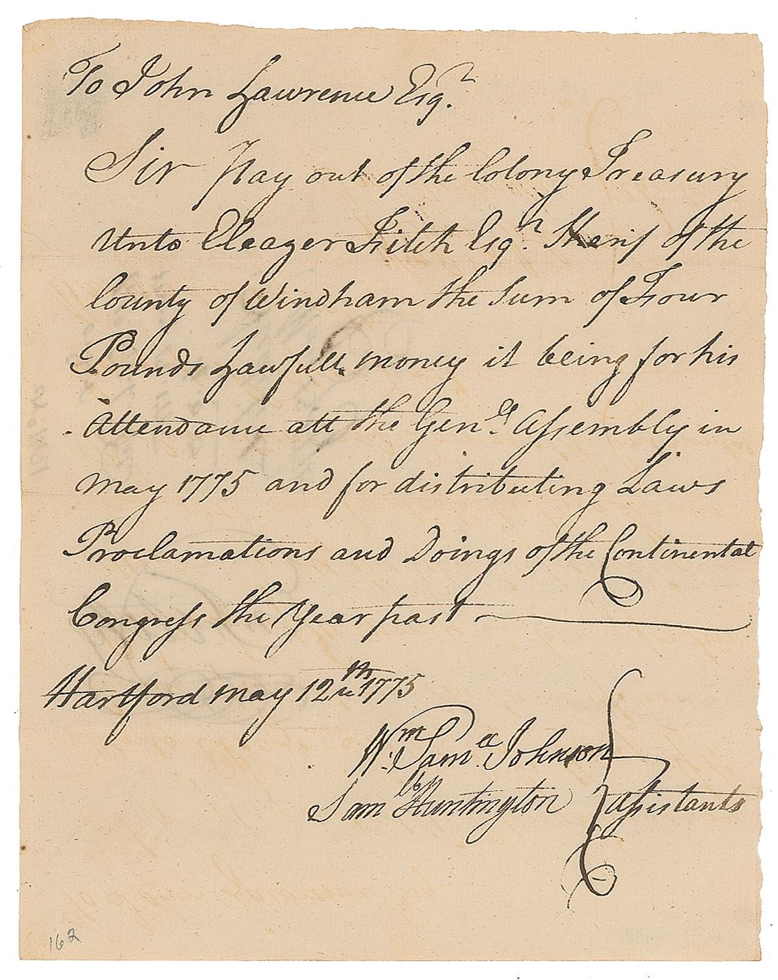 Revolutionary War–dated manuscript DS, signed “Sam. Huntington” and "Wm. Sam'l Johnson," one page, 6 x 7.75, May 12, 1775. Pay order issued to John Lawrence, in full: "Pay out of the Colony's Treasury unto Eleazer Fitch Esqr. Sheriff of the County of Windham the sum of Four Pounds Lawfull money it being for his attendance att the Gen'l Assembly in May 1775 and for distributing Laws Proclamations and Doings of the Continental Congress the Year past." In fine condition. Huntington is remembered for signing the Declaration of Independence and the Articles of Confederation, while Johnson is noted for signing the US Constitution. A desirable Revolutionary-era document from these important Connecticut political leaders.