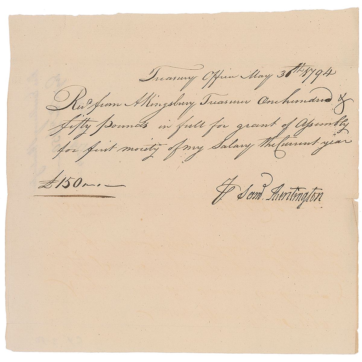 Signer of the Declaration of Independence from Connecticut (1731–1796) and seventh President of the Continental Congress. Manuscript DS, signed “Sam’l Huntington,” one page, 8.25 x 8, March 30, 1794. Treasury Office financial document, in full: “Rec’d from A. Kingsbury Treasurer one hundred & fifty pounds in full for grant of Assembly for first moiety of my Salary the Current year.” Boldly signed at the conclusion by Huntington. In fine condition, with expected document wear and a horizontal fold passing through the bottom of the signature. Accompanied by an unsigned engraving and a contemporary true manuscript copy of the payment document issued by the General Assembly of the State of Connecticut.