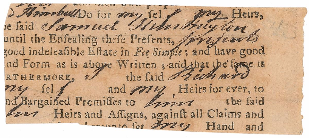Signer of the Declaration of Independence from Connecticut (1731–1796) and seventh president of the Continental Congress. Ink signature, “Samuel Huntington,” on an off-white 4 x 1.75 slip clipped from the body of a partly-printed document filled out in Huntington’s hand. In fine condition, with light toning.