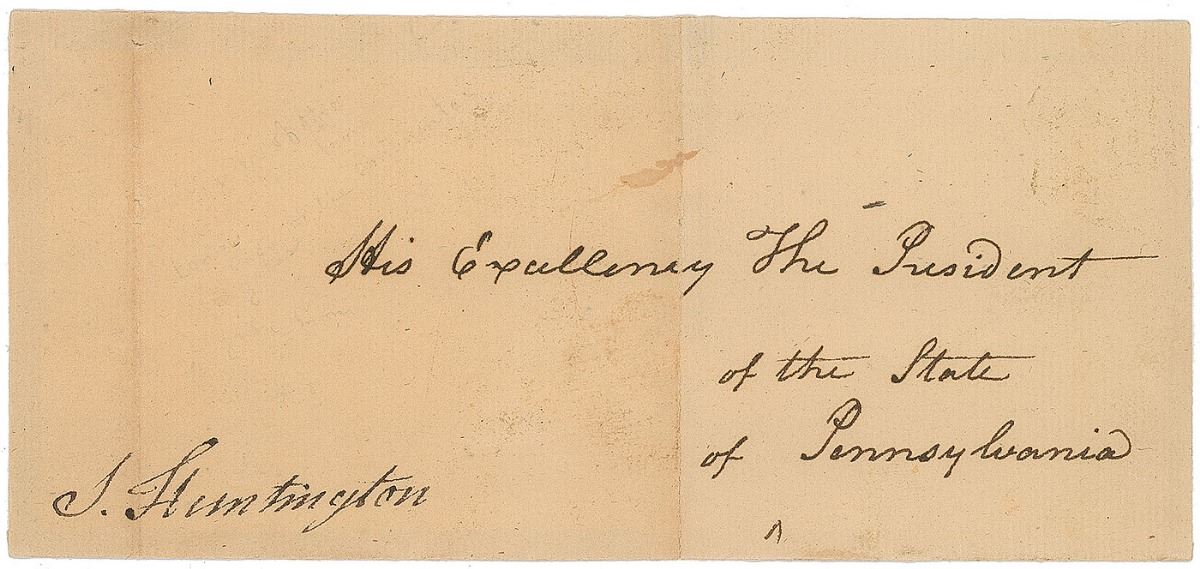Free franked address panel, 6.5 x 3, made out in another hand to “His Excellency The President of the State of Pennsylvania,” and franked in the lower left, “S. Huntington.” In very good condition, with a block of toning over the left side of the sheet, and old tape reinforcement to the fragile central vertical fold.