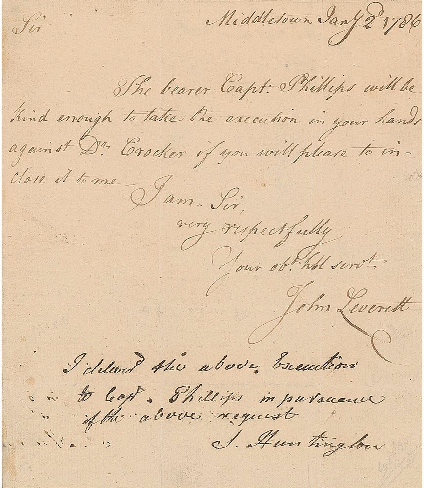 Signer of the Declaration of Independence from Connecticut (1731–1796) and seventh president of the Continental Congress. Autograph endorsement, "I deliver'd the above Executions to Capt. Phillips in pursuance of the above request, S. Huntington," at the conclusion of a letter sent to him by John Leverett, one page, 6 x 7, January 2, 1786. Leverett's request, in full: "The bearer Capt: Phillips will be kind enough to take the execution in your hands against Dr. Crocker if you will please to inclose it to me." Affixed to a larger sheet. In fine condition, with trimmed edges.