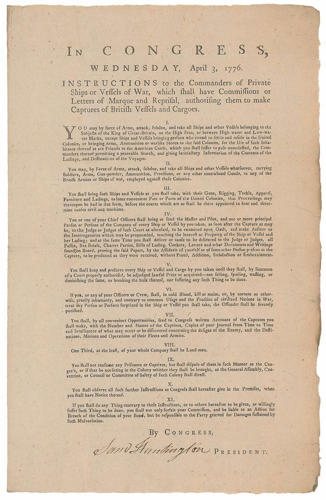 First issued by John Hancock in April 1776, this privateering proclamation was reprinted and used continually, as occasion demanded, throughout the Revolutionary War, with each example legitimized with the signature of the Congress president. After John Jay vacated the position to become Minister to Spain, Huntington was elected Continental Congress president on September 28, 1779, serving until ill health forced him to resign on July 10, 1781. The outcome of the Revolutionary War was significantly impacted by the role of private vessels; privateers greatly outnumbered the armada of the nascent American navy, and their recruitment and subsequent actions accounted for the seizure of hundreds of British ships.