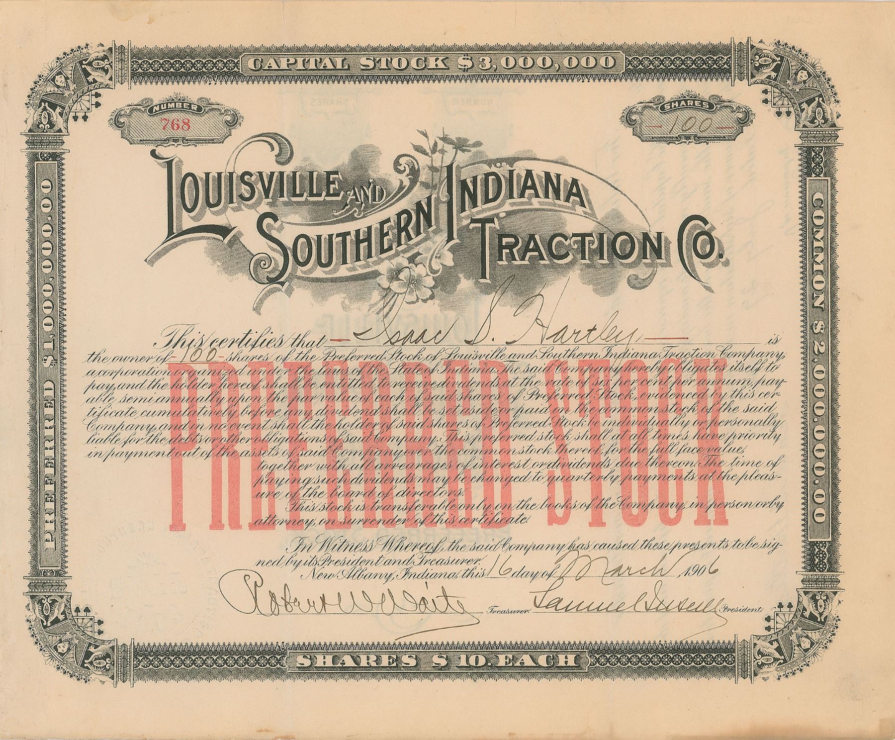 Partly-printed DS, one page, 10.75 x 8.75, March 16, 1906. Stock certificate for one hundred shares of the Louisville and Southern Indiana Traction Co., issued to "Isaac S. Hartley," and signed at the conclusion by Samuel Insull as president, with Robert W. Waite cosigning as treasurer. In fine condition.