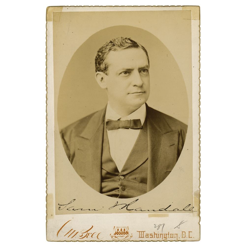 American politician from Pennsylvania (1828–1890) who served as the 29th Speaker of the House of Representatives, remembered as a staunch defender of protective tariffs. Uncommon 4.25 x 6.5 cabinet photo by C. M. Bell of Washington, signed at the bottom of the image in ink, "Sam. J. Randall." In fine condition, with small tape stains to the edges.