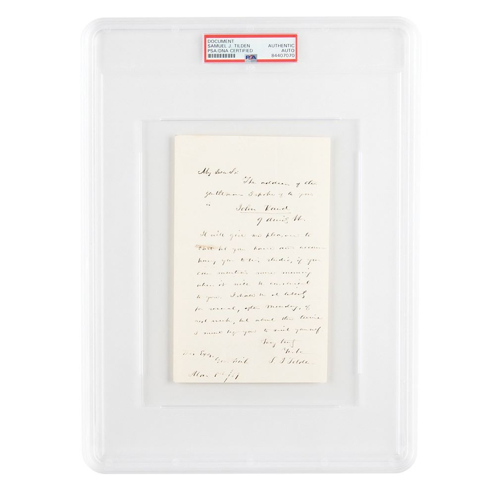ALS signed “S. J. Tilden,†one page, 4.5 x 7, March 8, 1857. Letter providing the address for John Rand, in part: "It will give me pleasure to call at your house and accompany you to his studio, if you can mention some morning when it will be convenient to you." In fine condition. Encapsulated in a PSA/DNA authentication holder.