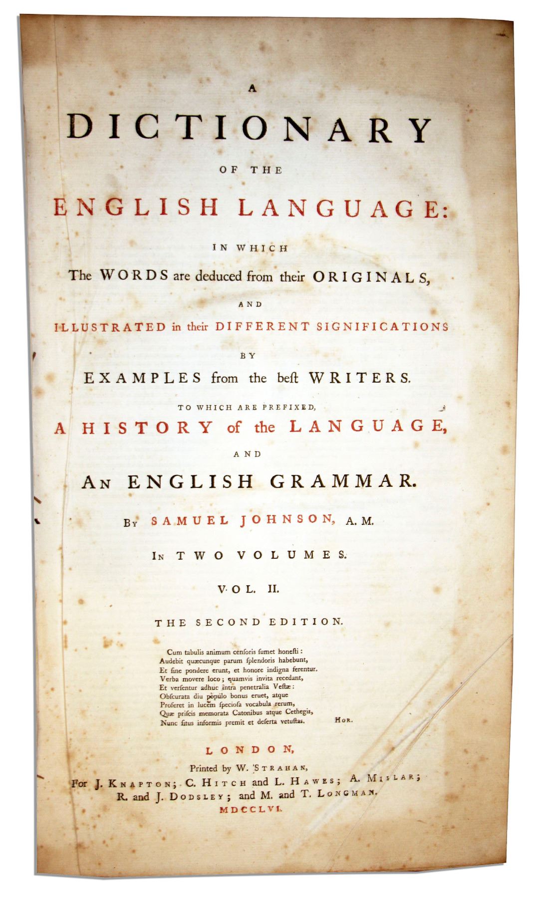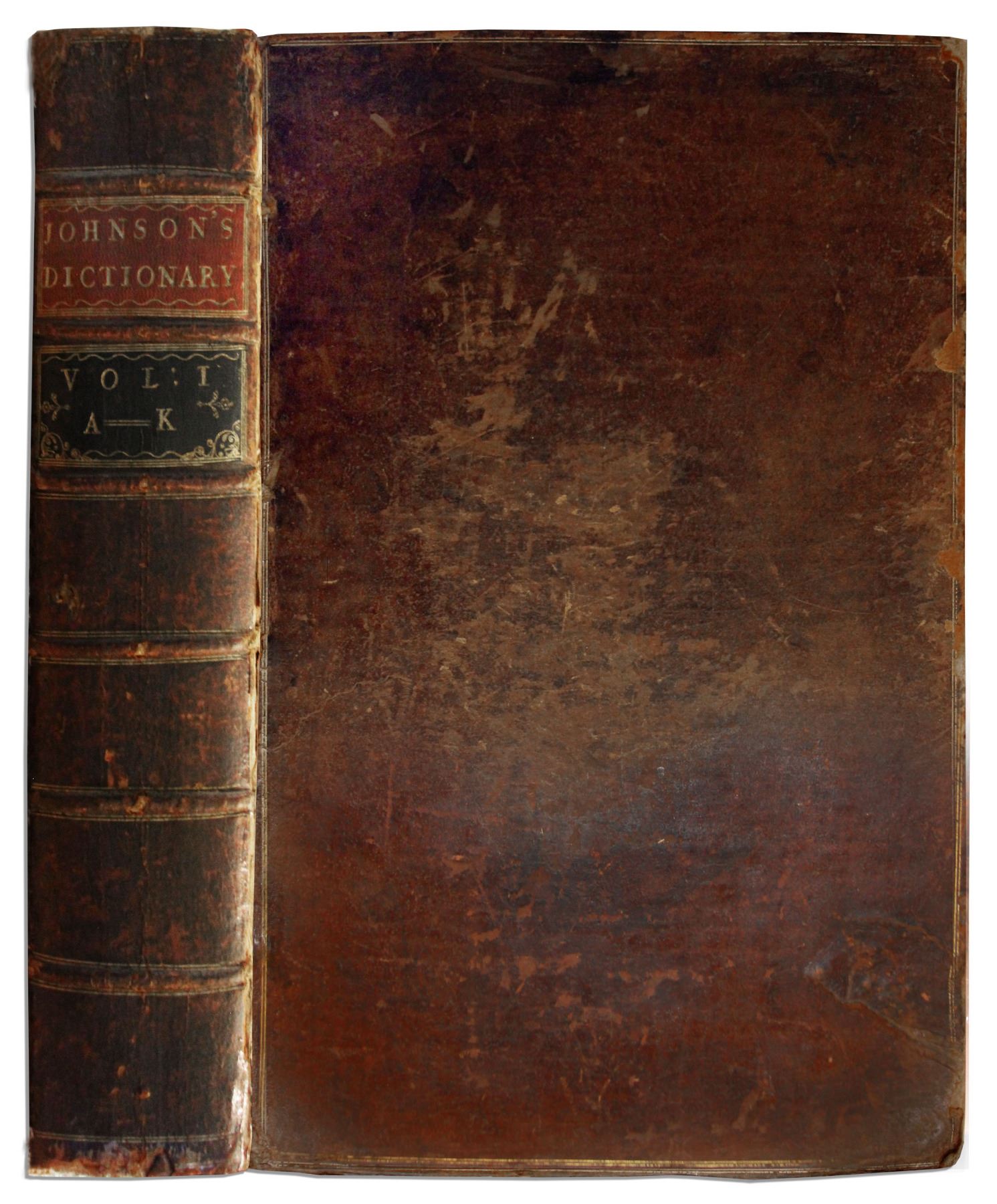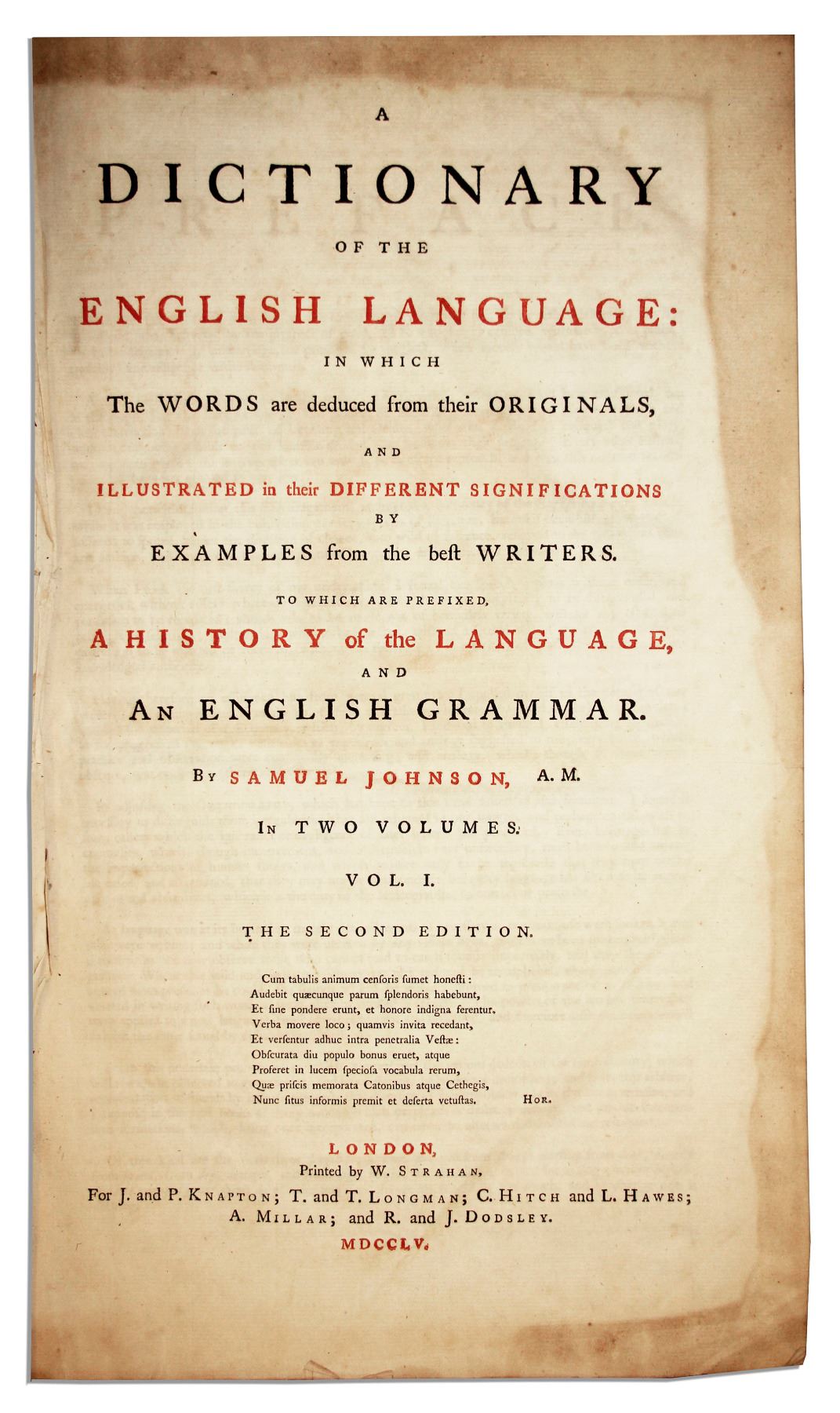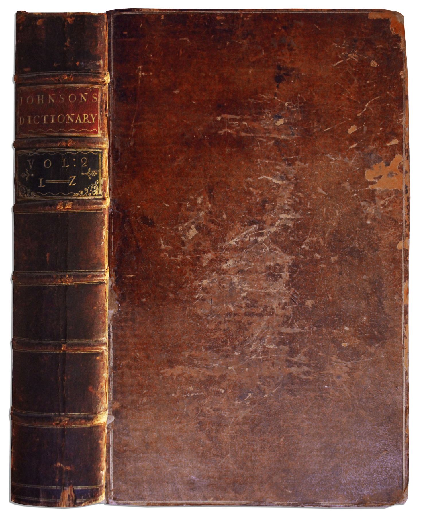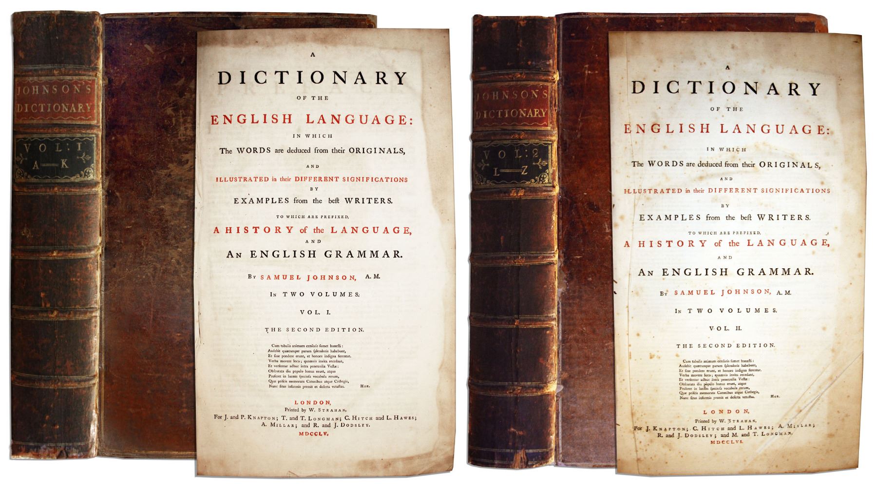 Very rare second edition of Samuel Johnson's seminal 1755 dictionary in two volumes. Large pair of leather-bound volumes house Johnson's unprecedented lexicographic achievement that catapulted him to fame as one of the most accomplished scholars in history. Titled in full, ''A Dictionary of the English Language: In Which the Words are Deduced from their Originals, and Illustrated in their Different Significations by Examples from the Best Writers. To Which are Prefixed, a History of the Language, and an English Grammar'', dictionary was printed by W. Strahan, for J. and P. Knapton: London: 1755. This work, which took Johnson eight years to craft, has been hailed by scholars as a crucial achievement in the literary world, and by extension, to English culture itself. Johnson and half a dozen assistants here catalogued over forty thousand words and provided examples of usage with more than one hundred thousand excerpts from existing literature. Johnson's dictionary reigned as the foremost reference through the end of the nineteenth century and Johnson became the subject of classic biography ''Life of Samuel Johnson'' by James Boswell. Each volume is bound in original leather boards with gilt trim and ribbed spine, measuring 11'' x 16.5''. Prior owner's bookplate is affixed to both front pastedowns and first few leaves show scattered pencil notations. Integral blanks at front and rear are detached as is a ''Q'' page in the second volume. Abrasions to boards and edges, and separation of boards at hinges though still attached, all typical of age. Overall a nicely preserved set of one of the greatest achievements in academia.
