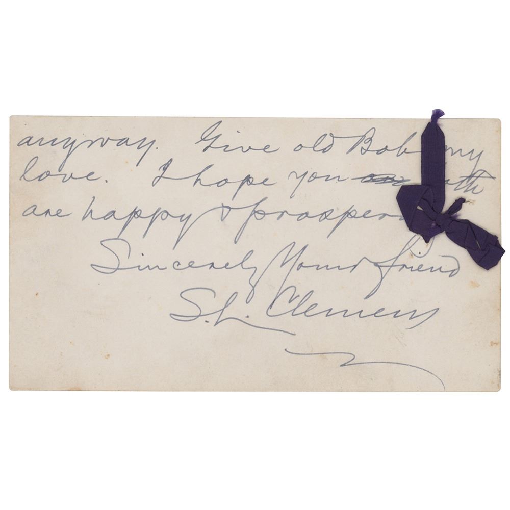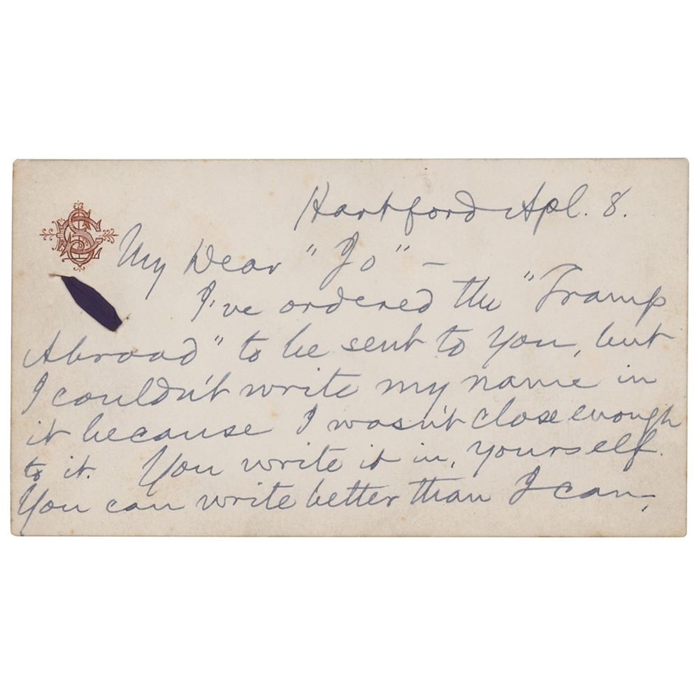 ALS signed "S. L. Clemens," penned on both sides of his 5 x 3 personal monogrammed stationery, April 8 (no year, circa 1880). Letter to "My Dear 'Jo,'" in full: "I've ordered the 'Tramp Abroad' to be sent to you, but I couldn't write my name in it because I wasn't close enough to it. You write it in, yourself. You can write better than I can, anyway. Give old Bob my love. I hope you both are happy & prospering." In fine condition, with some scattered light toning, mostly to edges. Published in 1880, The Tramp Abroad is the fourth of Mark Twain's six travel books published during his lifetime and is often thought to be an unofficial sequel to the first one, The Innocents Abroad from 1869. A mixture of autobiography and fictional events, the book details a journey by the author, with his friend Harris (a character created for the book, and based on his closest friend, Joseph Twichell), through central and southern Europe.