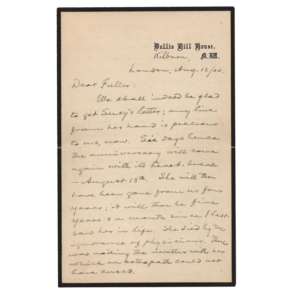 ALS signed “Mark,†four pages on two adjoining sheets, 4.5 x 7, Dollis Hill House letterhead, August 12, 1900. Handwritten letter to "Fuller," first commenting on his late daughter, Susy, then discussing the benefits of plasmon—a proprietary dried milk in which Clemens was an investor.