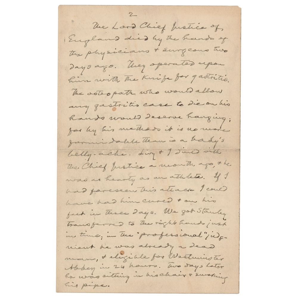 In full: "We shall indeed be glad to get Susy's letter; any line from her hand is precious to us, now. Six days hence the anniversary will come again with its heart-break—August 18th. She will then have been gone from us four years; it will then be five years & a month since I last saw her in life. She died by the ignorance of physicians. There was nothing the matter with her which an osteopath could not have cured. The Lord Chief Justice of England died by the hands of the physicians & surgeons two days ago. They operated upon him with the knife for gastritis. The osteopath who would allow any gastritis case to die on his hands would deserve hanging; for by his methods it is no more formidable than is a baby's belly-ache. Livy & I dined with the Chief Justice a month ago, & he was as hearty as an athlete. If I had foreseen this attack I could have had him cured & on his feet in three days. We got Stanley transferred to the right hands just in time; in the 'professional' judgment he was already a dead man, & eligible for Westminster Abbey in 24 hours. Two days later he was sitting in his chair & smoking his pipe.